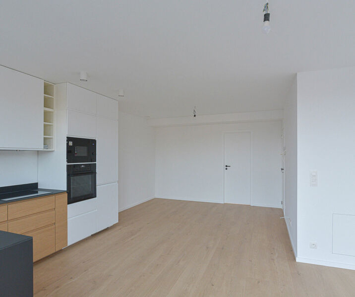Entrance hall with a separate toilet, a bathroom with (bathtub, sink, and washing machine connection) a bright living and dining room of +/-28 m² with access to a spacious terrace and a fully equipped kitchen, a first bedroom/office of +/-10 m² on the upper floor we can find a storage space, the second bedroom of +/-15m² with a shower room and toilet. Possibility to rent a garge box + 150€/month.