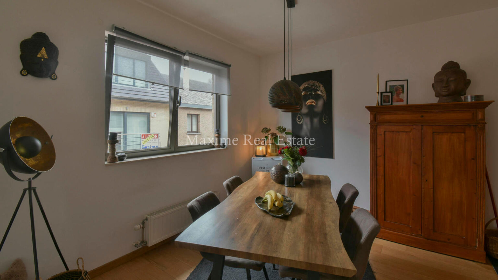 Entrance hall with separate toilet, bright living-dining room +/- 34m², fully equipped kitchen (dishwasher, fridge, freezer, oven, ...), 1st bedroom +/- 14,5m² with adjoining bathroom (bath, double sink and toilet), 2nd bedroom +/- 17,5m² with adjoining shower room (shower and sink), night hall with office corner.