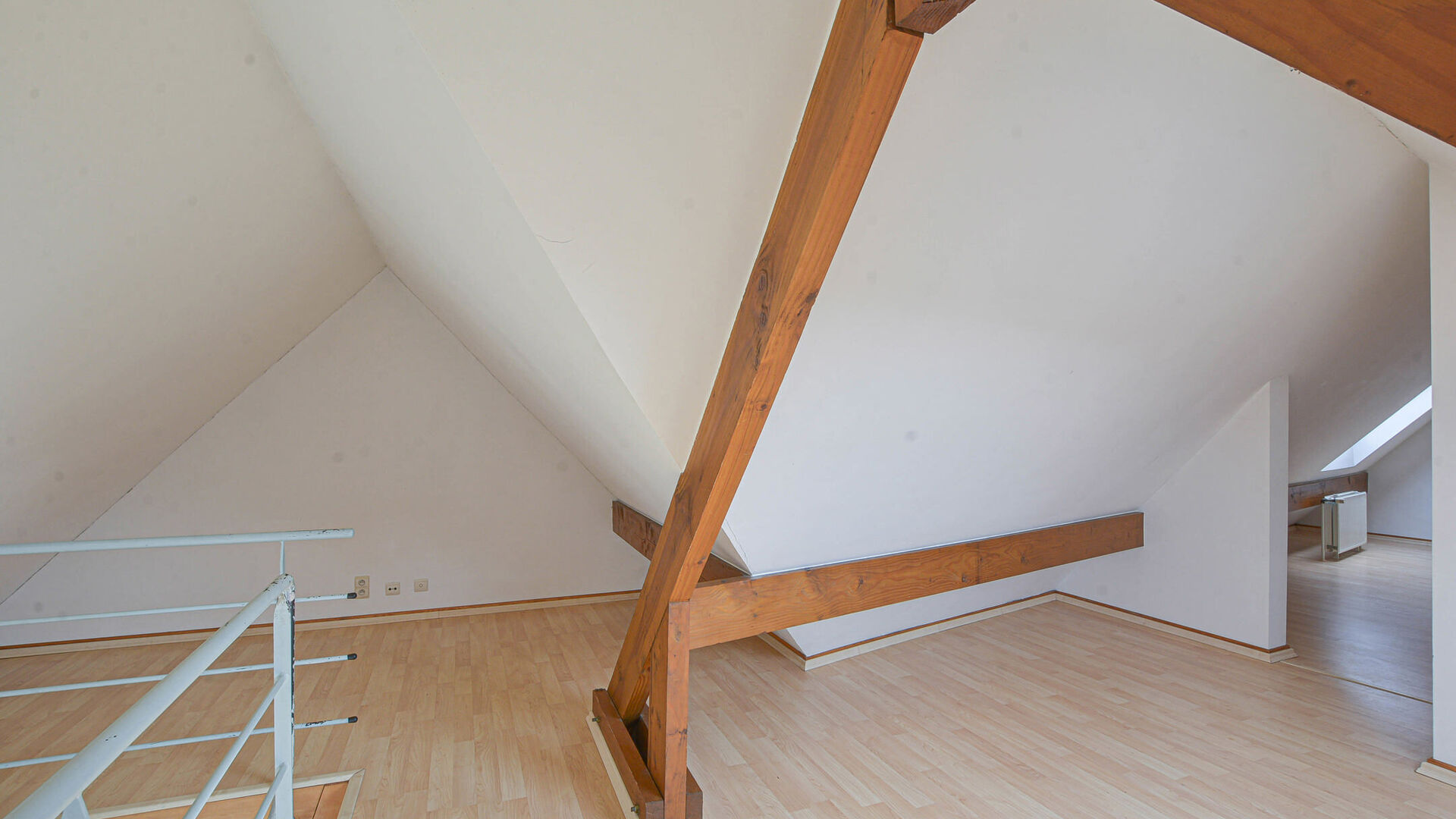 Entrance hall, bright living-dining room +/-27m² giving access to a small terrace, equipped kitchen, night hall with toilet, first bedroom +/-14m² with en-suite bathroom (bathtub with shower, sink and connection washing machine). 2nd bedroom/polyvalent space +/-16m² under 'mezzanine' with office area.
