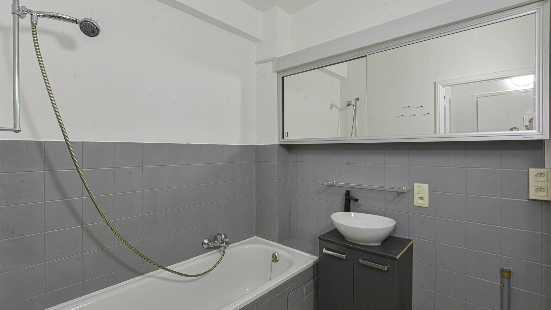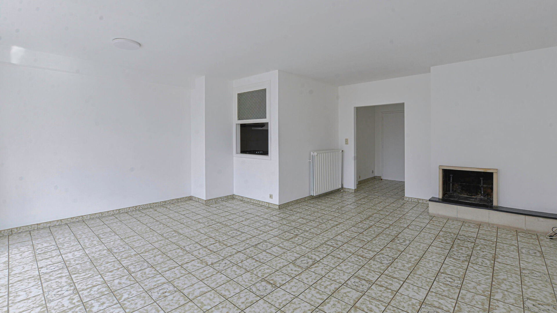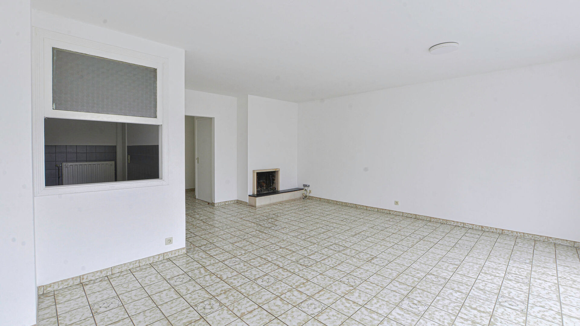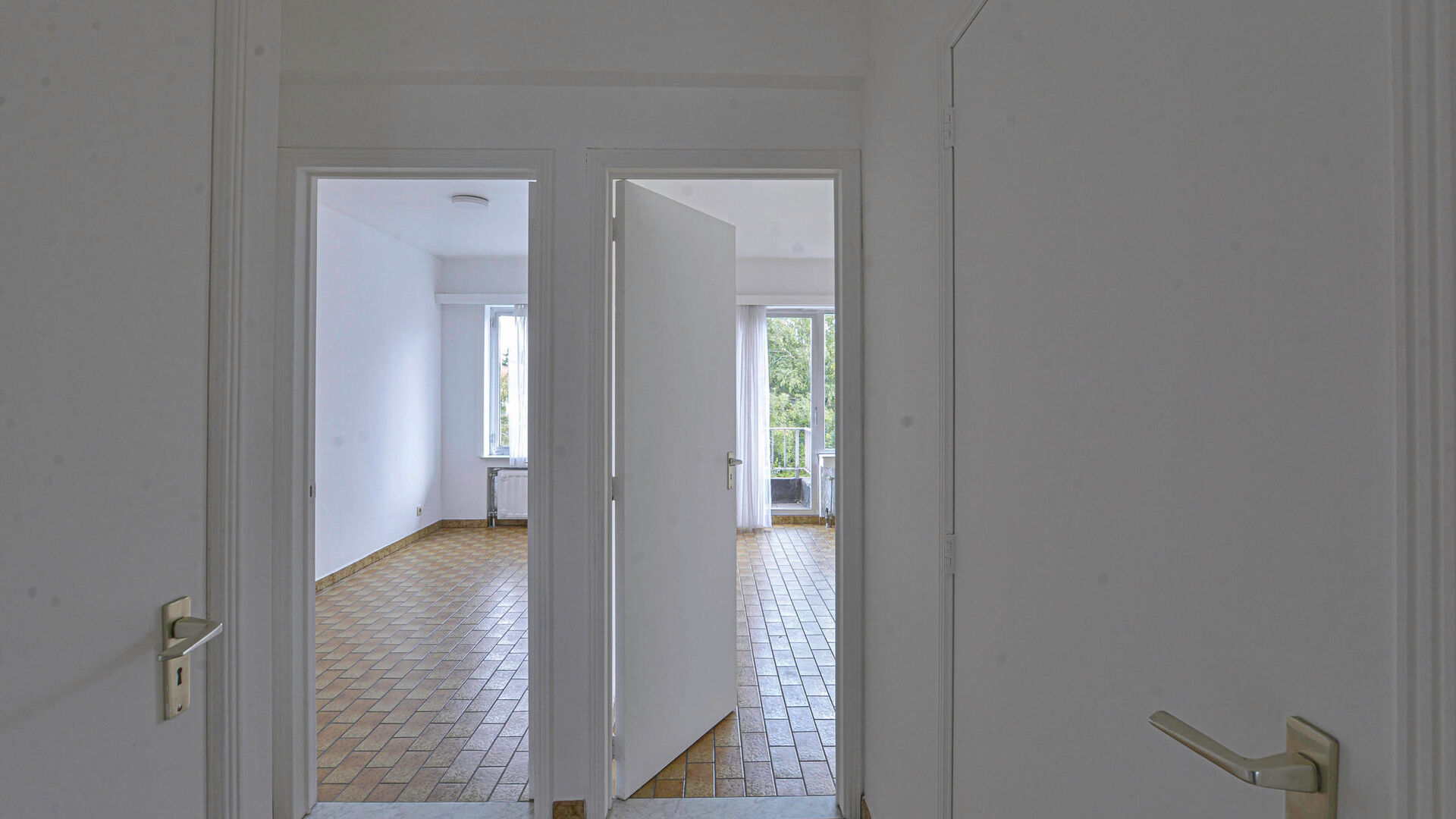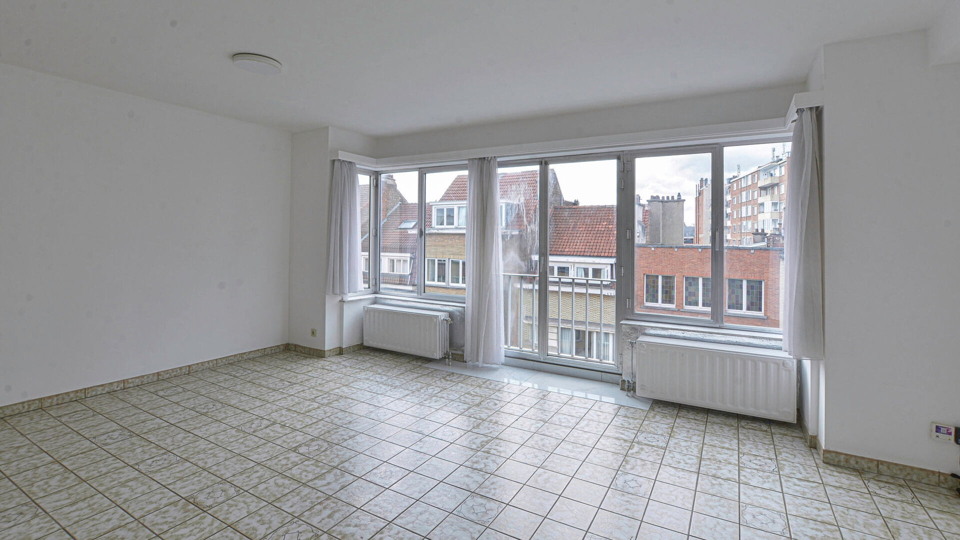 Entrance hall with vestiaire// bright living room +/-26m² // unfurnished kitchen (only gas hob) // night hall with separate toilet and storage // 2 bedrooms +/- 9m² and 14m², the larger one giving access to the balcony // bathroom (bathtub, sink, and space for washing machine).