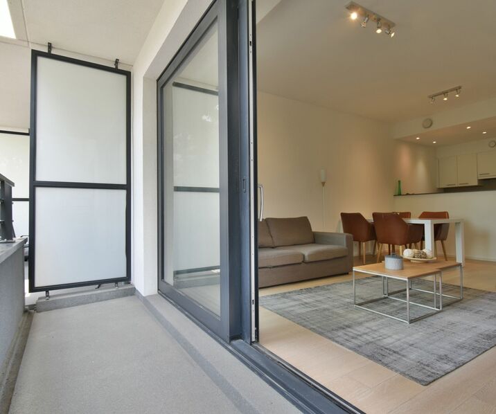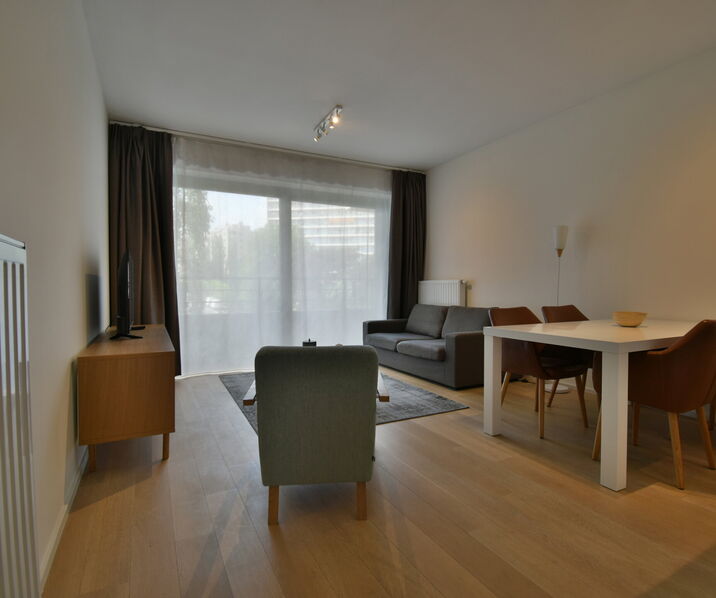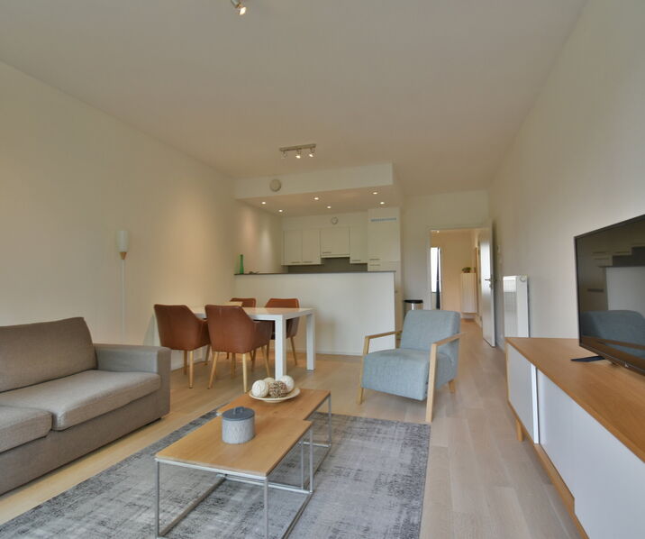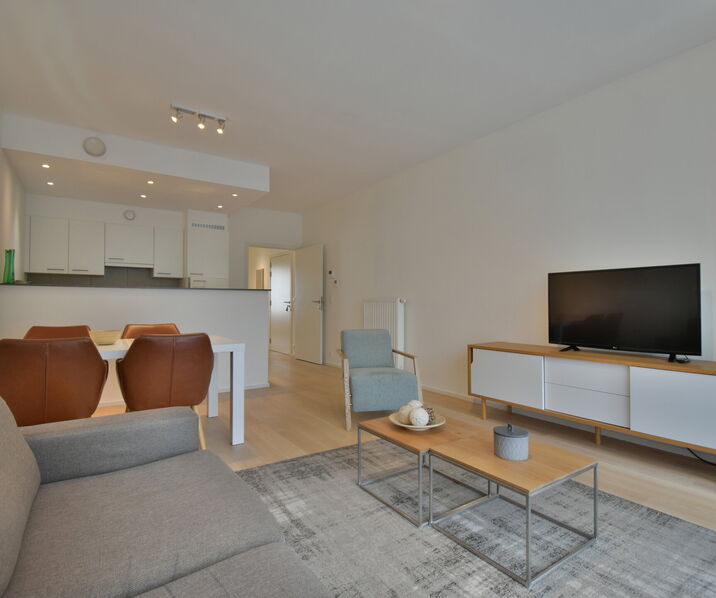 Entrance hall with separate toilet // storage room // living room +/- 30m² with access to the southwest-facing terrace +/-11m² // fully equipped kitchen (sink, cooking plates, extractor hood, dishwasher, fridge with freezer) // bedroom +/- 14m² // bathroom (bathtub with shower, double sink).