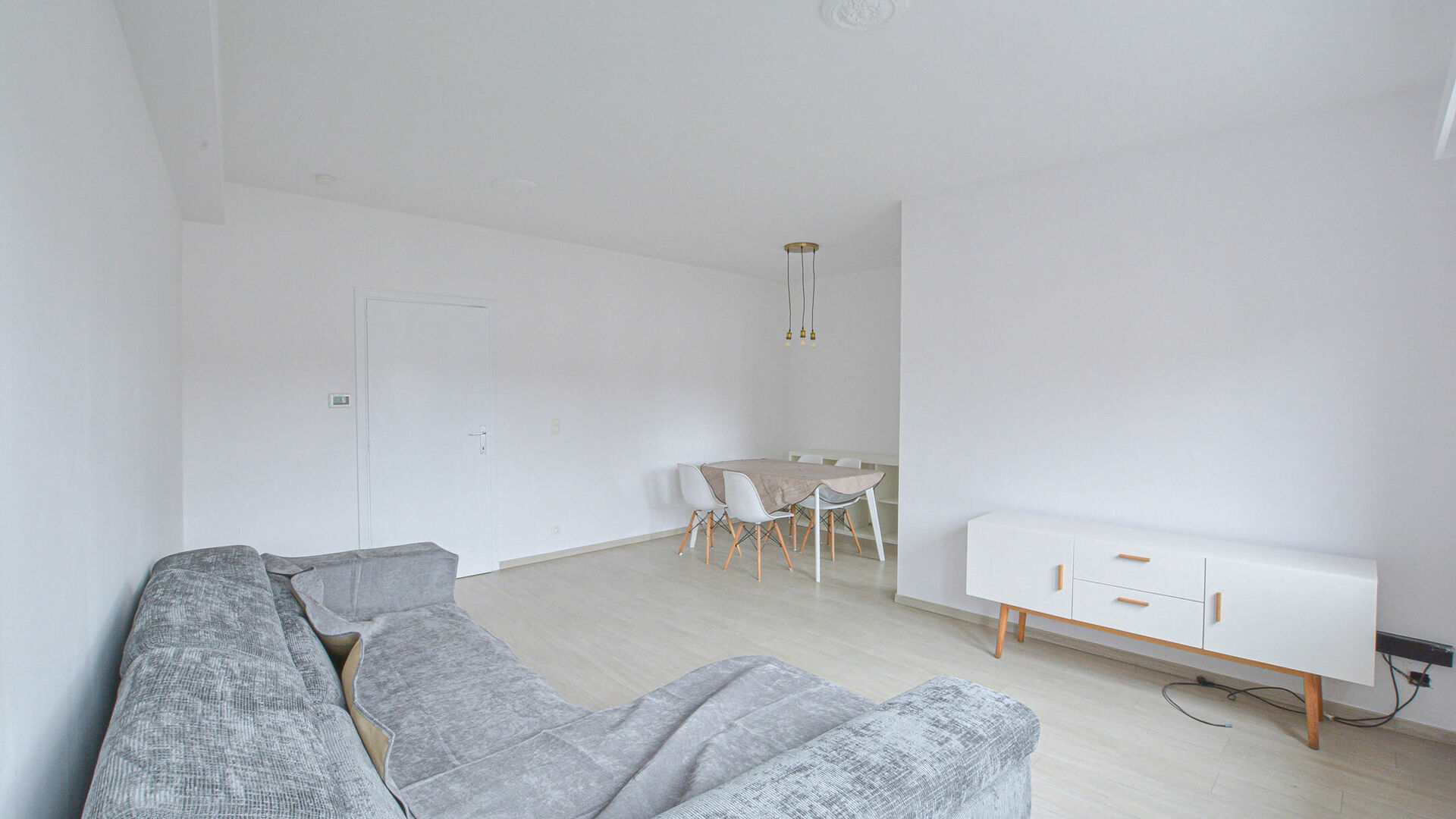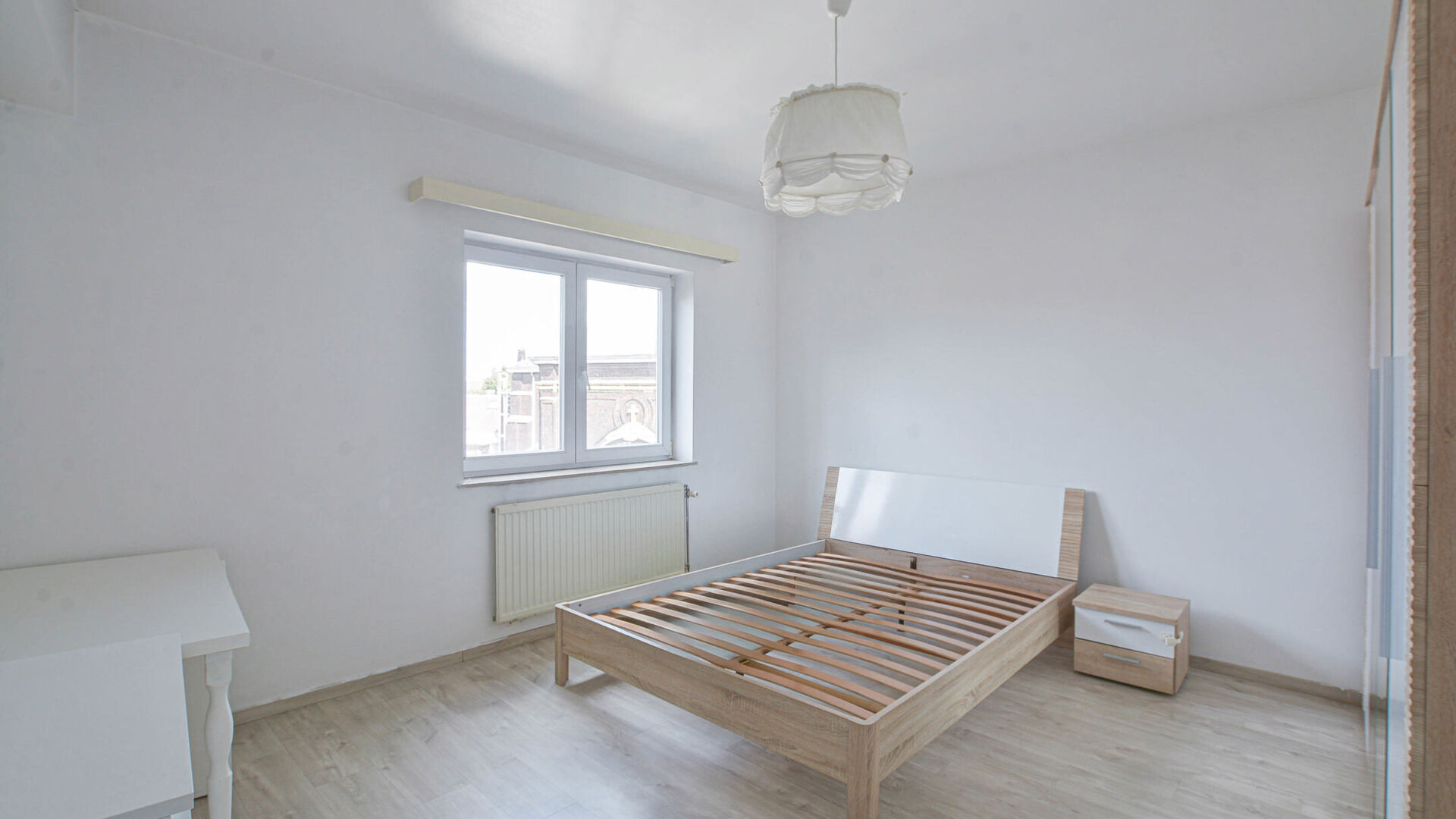 An entrance hall leads to a bright living and dining area of +/-23 m², a equipped kitchen with cooker, oven, fridge-freezer, and connection for a washing machine. The night hall provides access to a separate toilet, a storage room, a bedroom of +/-15 m², and a new bathroom fitted with a walk-in shower and sink.