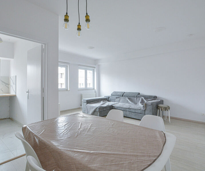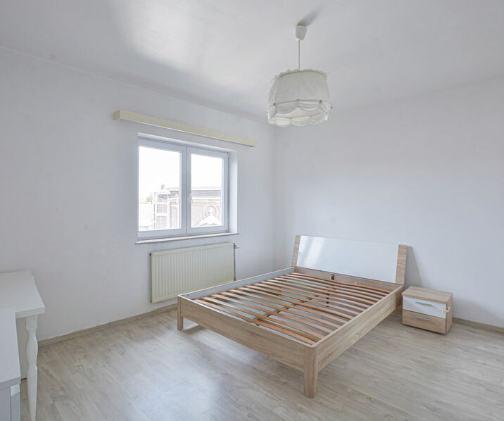 An entrance hall leads to a bright living and dining area of +/-23 m², a equipped kitchen with cooker, oven, fridge-freezer, and connection for a washing machine. The night hall provides access to a separate toilet, a storage room, a bedroom of +/-15 m², and a new bathroom fitted with a walk-in shower and sink.
