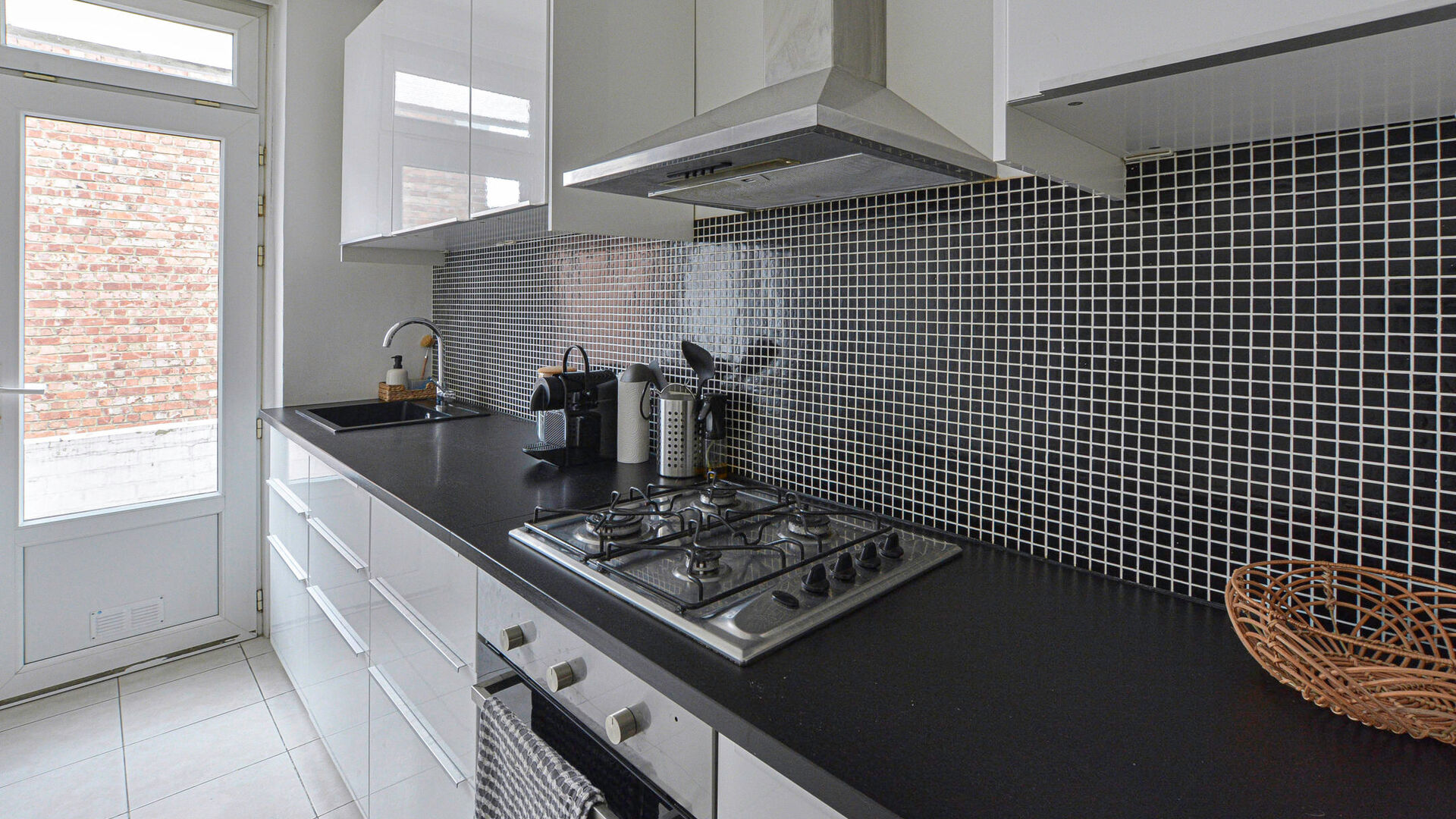 Entrance hall with separate toilet // bright living room +/-24 m² // semi-equipped kitchen (fridge with freezer, oven, hob) with access to the balcony // bedroom +/-12 m² // bathroom with bathtub, sink, and laundry area.