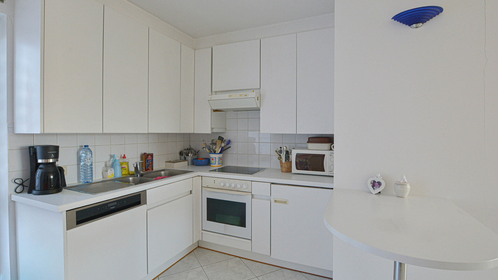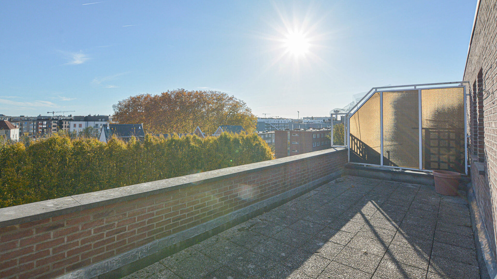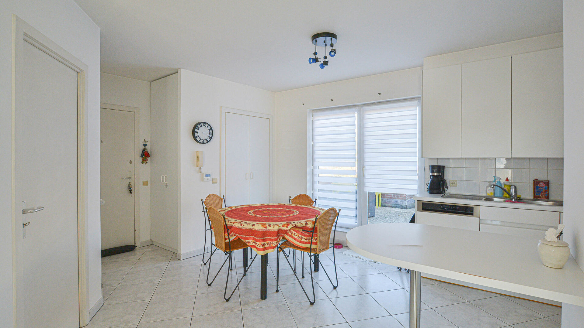 Entrance hall with built-in wardrobes, bright living and dining room of +/-35m² with a fully equipped open kitchen, providing access to two large terraces. Bedroom of +/-10 m² with built-in wardrobe, bathroom with bathtub, toilet, and sink.