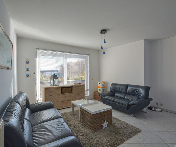 Entrance hall with built-in wardrobes, bright living and dining room of +/-35m² with a fully equipped open kitchen, providing access to two large terraces. Bedroom of +/-10 m² with built-in wardrobe, bathroom with bathtub, toilet, and sink.