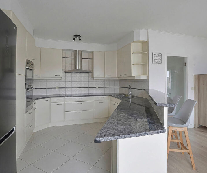 Entrance hall with cloakroom area, bright living room of +/-50 m² with a fully equipped open kitchen, 2 spacious bedrooms of +/-20 m² and 14 m², renovated bathroom (walk-in shower, toilet, sink, and connections for a washing machine/dryer), 3rd bedroom suitable for a child or office of +/-7 m², and a second bathroom (bathtub, sink, and toilet).
