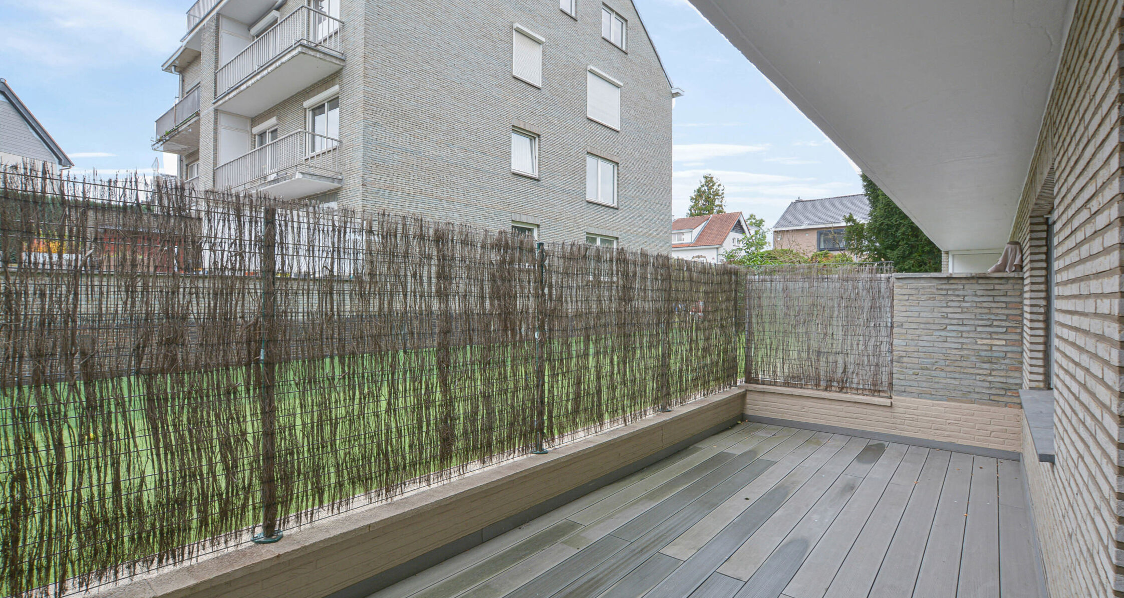 Entrance hall with cloakroom and separate toilet leads to a bright living and dining room of +/-30m², fully equipped kitchen with hob, oven, dishwasher, fridge/freezer and connection for a washing machine. A night hall with storage space gives access to two bedrooms of +/-15m² and 11m², one of them giving access to the south-facing terrace of +/-10m².