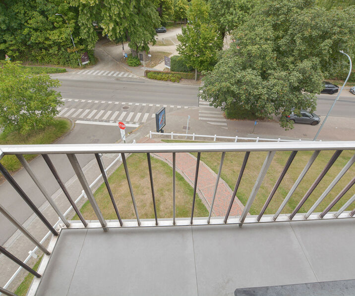 Entrance hall, bright living-dining room of +/- 25m² with terrace and view over the park, fully equipped kitchen (hob, oven, dishwasher, fridge/freezer, …), night hall with cloakroom, separate toilet and laundry room. Three bedrooms (14m² – 10m² – 7m²), one of them gives access to the South-facing terrace of +/- 6m², bathroom with sink and bathtub.