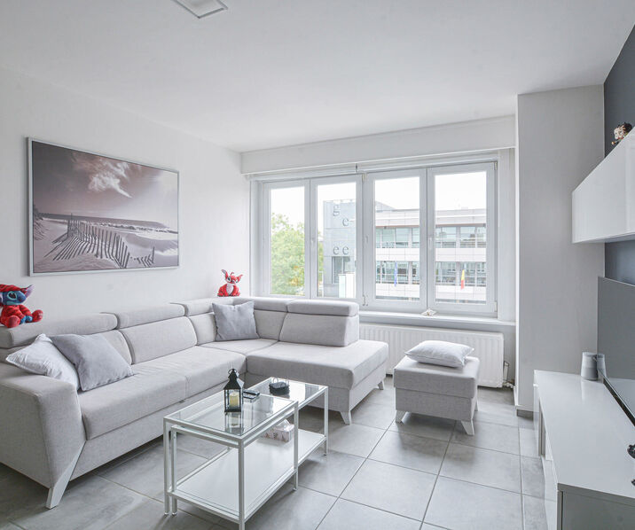 The layout is as follows: Entrance hall with separate toilet, Bright living–dining room of ±27 m², Fully equipped kitchen with connections for a washing machine and dryer, Two spacious bedrooms of ±15 m² and 13 m², both with access to a ±5 m² terrace, Dressing room, Bathroom with walk-in shower and sink. A private cellar is included in the sale of the apartment. For properties with an EPC score of E or F, a renovation obligation applies, requiring at least label D within five years of purchase.