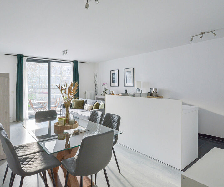 Entrance hall with separate toilet and cloakroom, bright living-dining room +/-25m², access to a south terrace, equipped open kitchen (hob, oven, fridge) with breakfast corner. Night hall with laundry room-storage room, 2 bedrooms +/-14-10m² and bathroom with bath and double sink