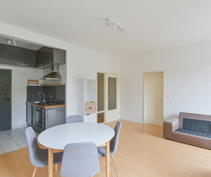 Entrance hall with built-in wardrobe and separate toilet, bathroom with bathtub and sink. The bright living and dining room of +/-21 m² gives access to a large terrace, fully equipped kitchen with storage/technical room and a bedroom of +/-14 m².