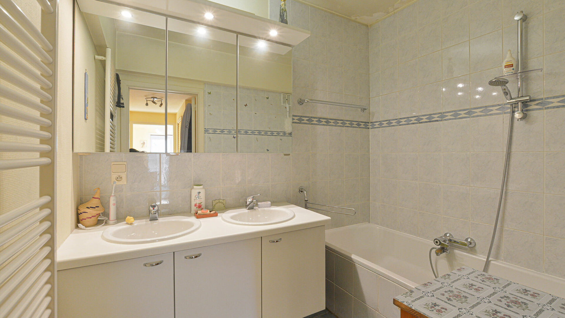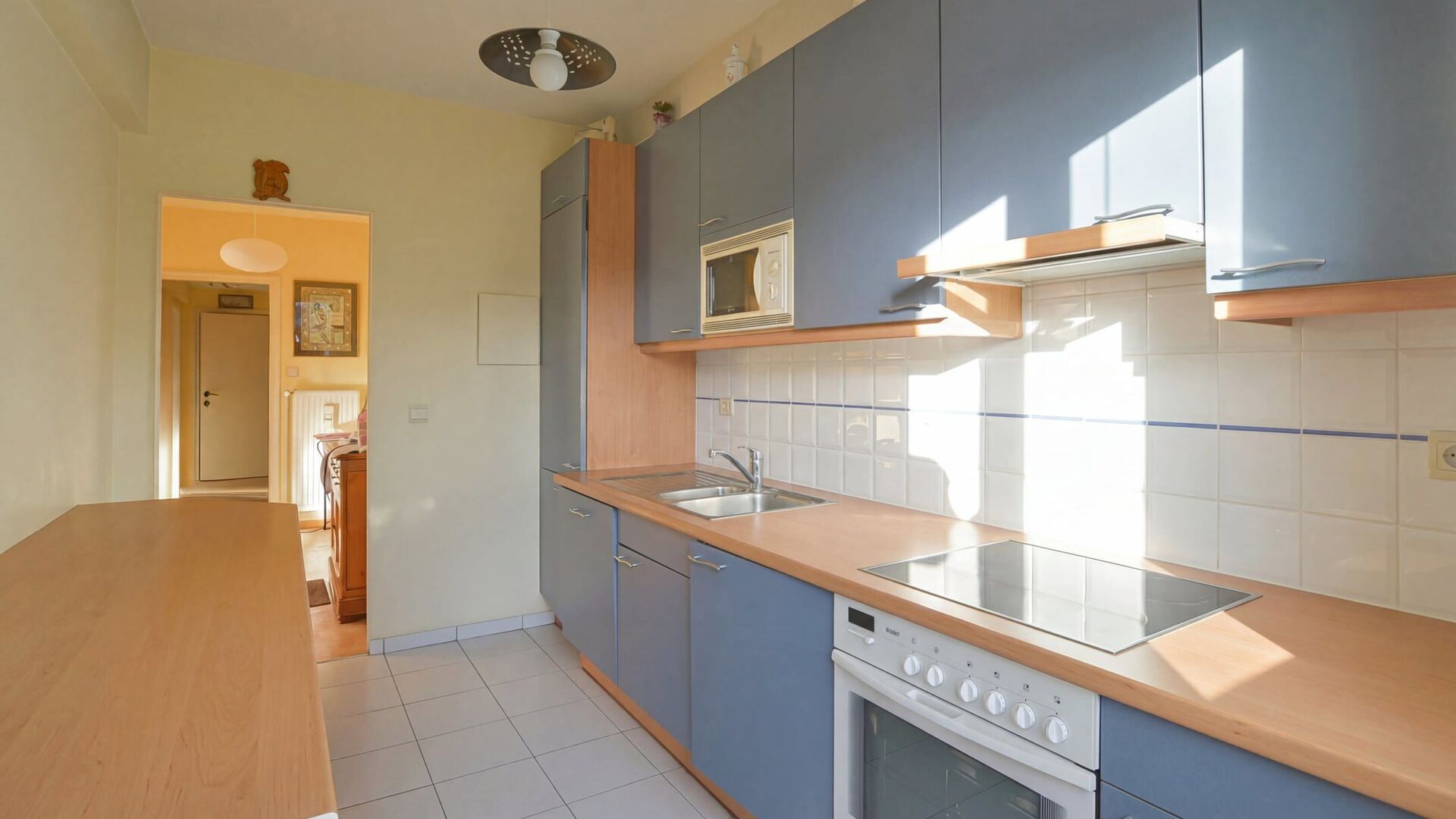 Entrance hall with space for a cloakroom cupboard, bright living/dining room of +/-27 m² giving access to a south-facing terrace, fully equipped kitchen with a small balcony (e.g. for garbage bags). Night hall with storage room and separate toilet,2 beautiful bedrooms of +/-12 m² and a bathroom with bathtub and double sink.
