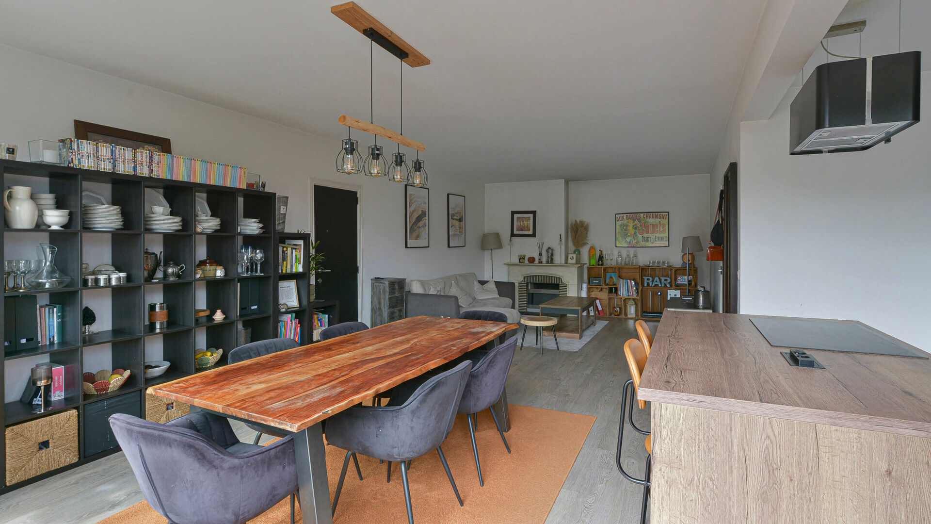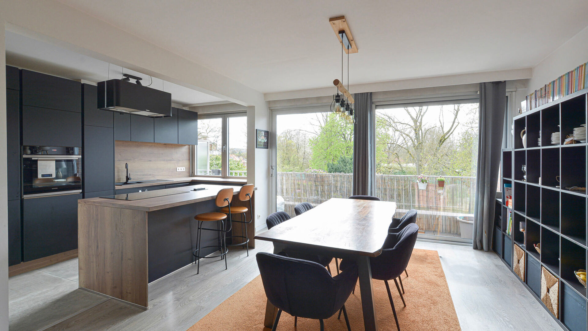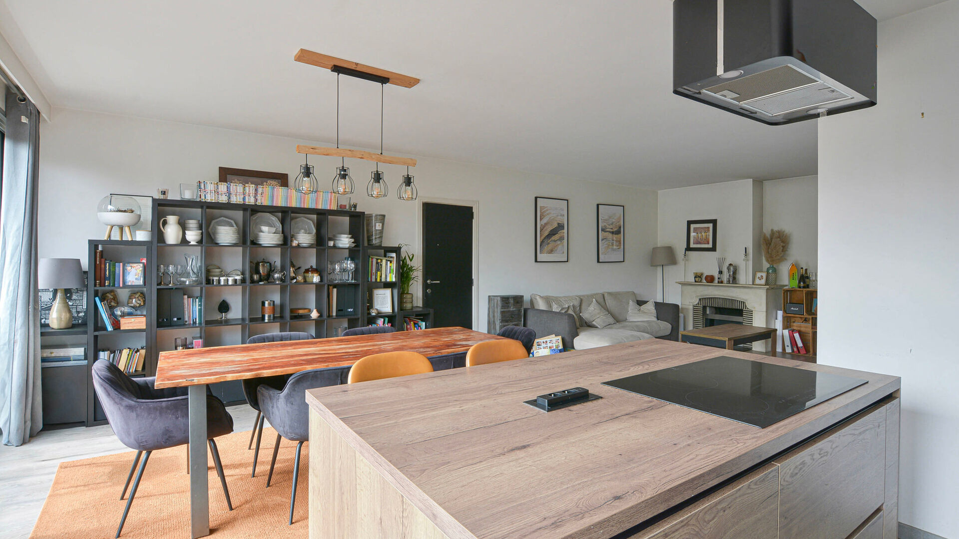 Entrance hall with cloakroom and storage room with connections for a washing machine/dryer. Bright living-dining room of +/-36 m² giving access to a south-facing terrace, fully equipped open kitchen with central cooking island / breakfast area. Night hall with toilet, 2 bedrooms of +/-15 and 12 m², bathroom with bathtub and sink.