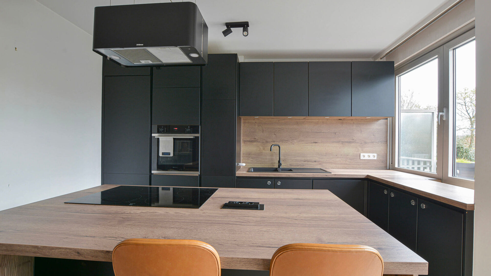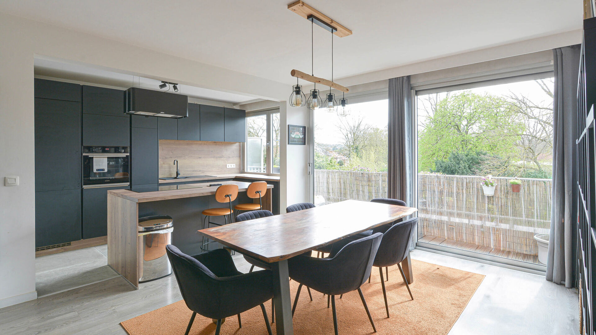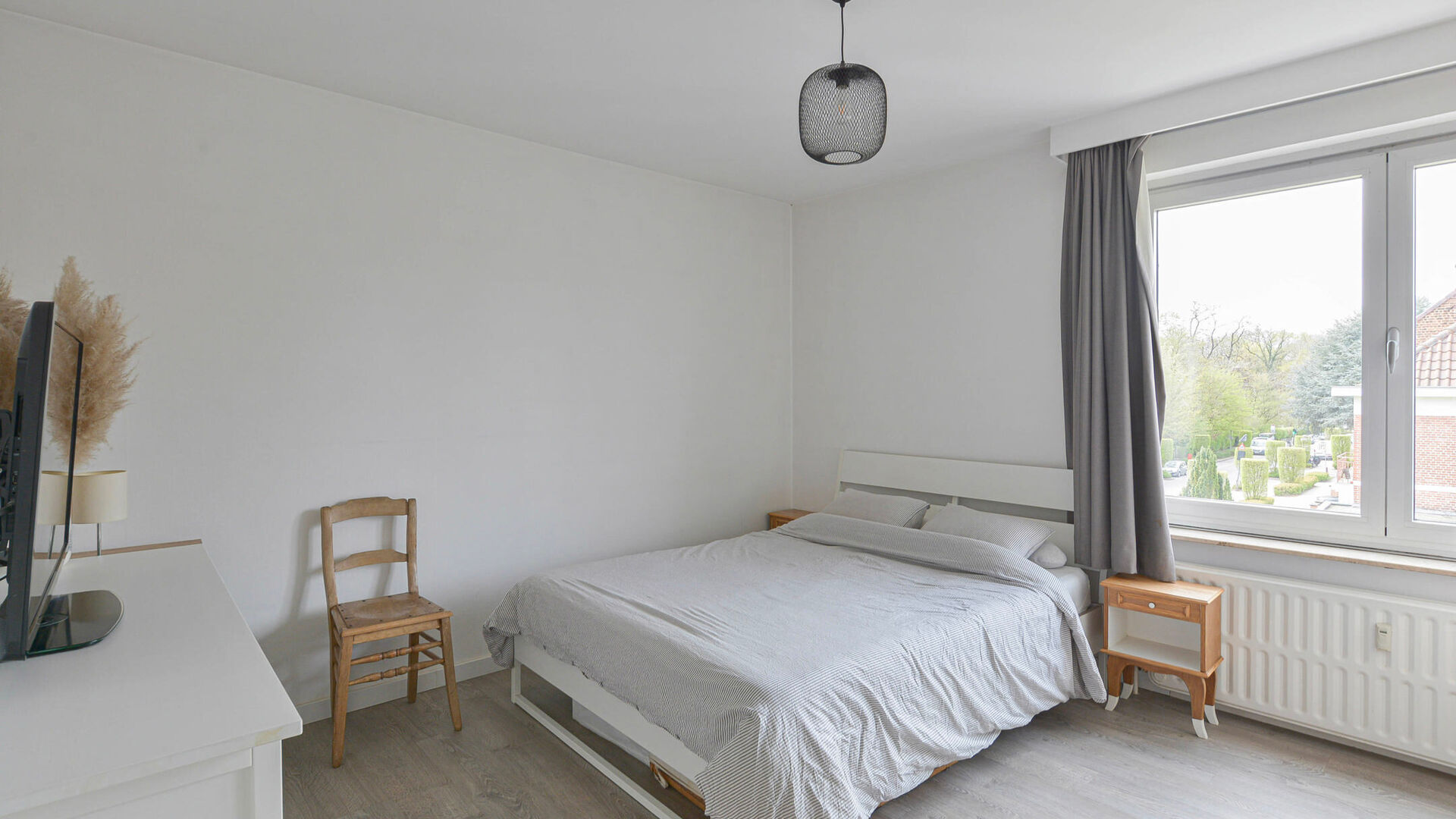 Entrance hall with cloakroom and storage room with connections for a washing machine/dryer. Bright living-dining room of +/-36 m² giving access to a south-facing terrace, fully equipped open kitchen with central cooking island / breakfast area. Night hall with toilet, 2 bedrooms of +/-15 and 12 m², bathroom with bathtub and sink.