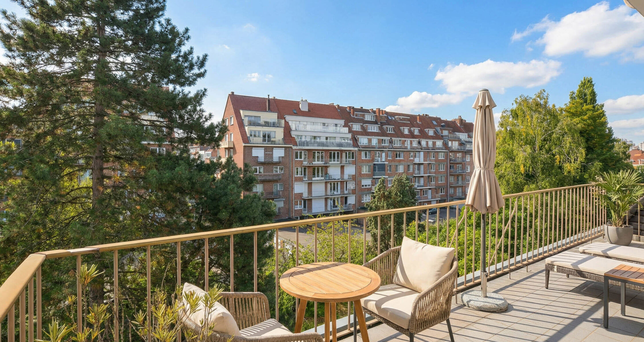 Entrance hall with cloakroom and toilet, bright living and dining room of ± 60 m² with decorative fireplace and access to two large terraces (SOUTH/NORTH). The south-facing terrace is ± 15 m² and offers an open view over the surrounding gardens. Fitted kitchen (hob, oven, dishwasher, fridge/freezer) with breakfast corner, first bedroom ± 11 m² with built-in wardrobe and sink, bathroom with bathtub, sink, connections for washing machine/dryer, and master bedroom ± 16 m² with built-in wardrobes and access to the terrace.