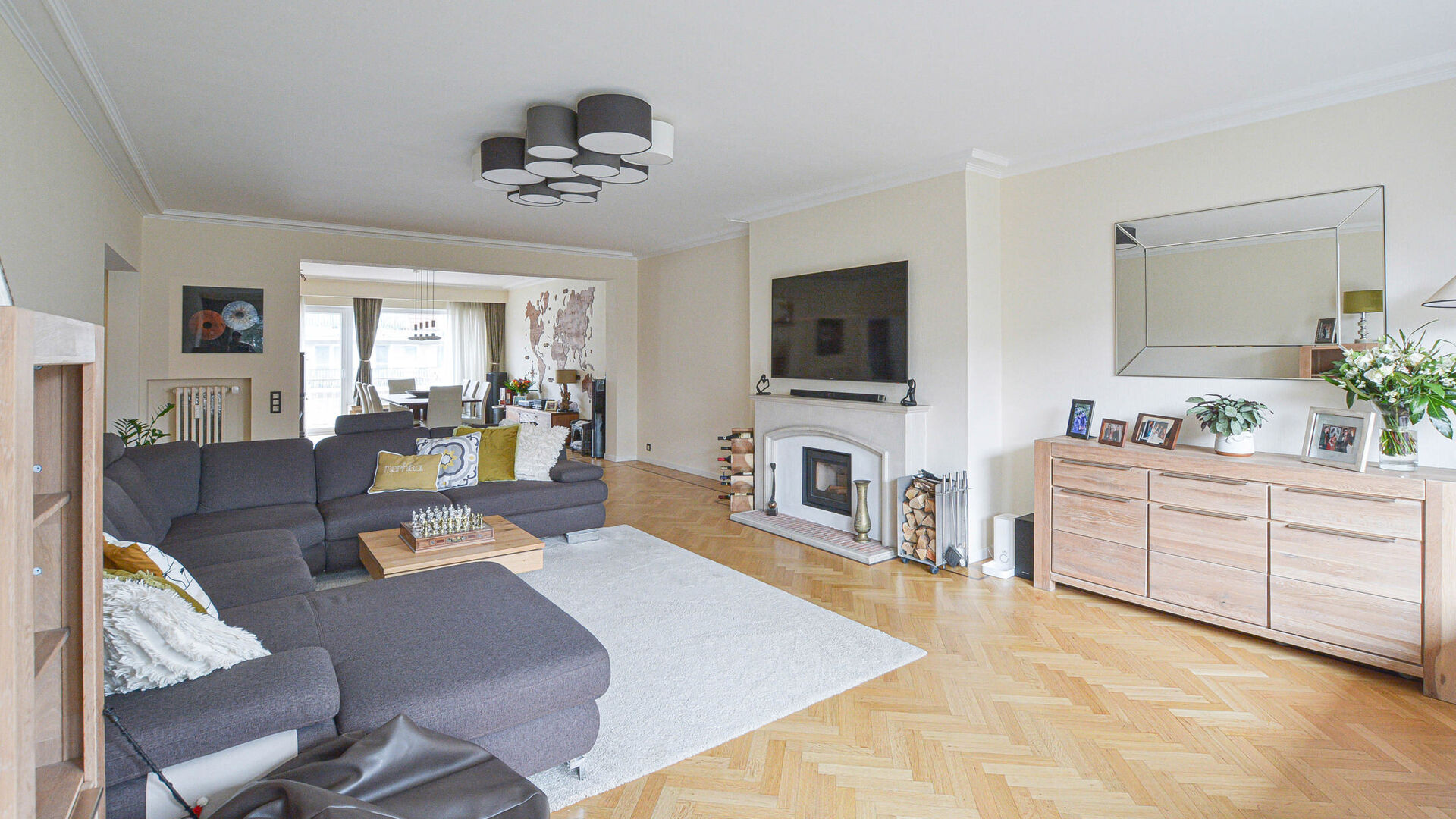 Spacious entrance hall with built-in cloakroom, bright living and dining room of +/- 60m² with working fireplace on wood and access to two large terraces (SOUTH/NORTH), the south-facing terrace of +/- 15m² offering an open view over the surrounding gardens. New fully equipped kitchen (hob, classic oven with microwave function, steamoven, dishwasher, fridge/freezer) with breakfast area. Night hall with separate toilet, master bedroom of +/- 16m² with en-suite bathroom (shower and sink) and access to the south-facing terrace, 2 bedrooms of +/- 11-10m², new bathroom (bathtub with shower, sink), storage room with connection for washing machine/dryer.