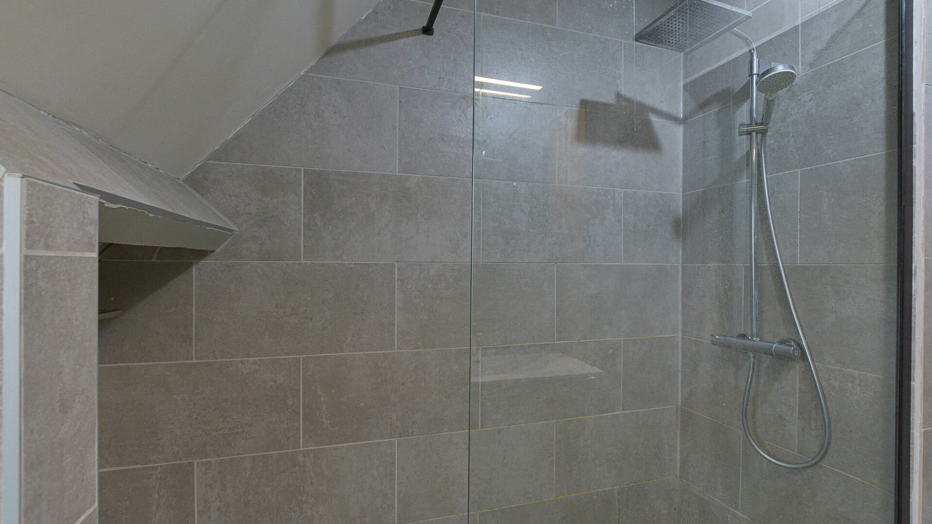 Ground floor: Entrance hall with toilet, living-dining room of +/-30 m² with a fully equipped open kitchen, terrace, and spacious garden with a garden shed.