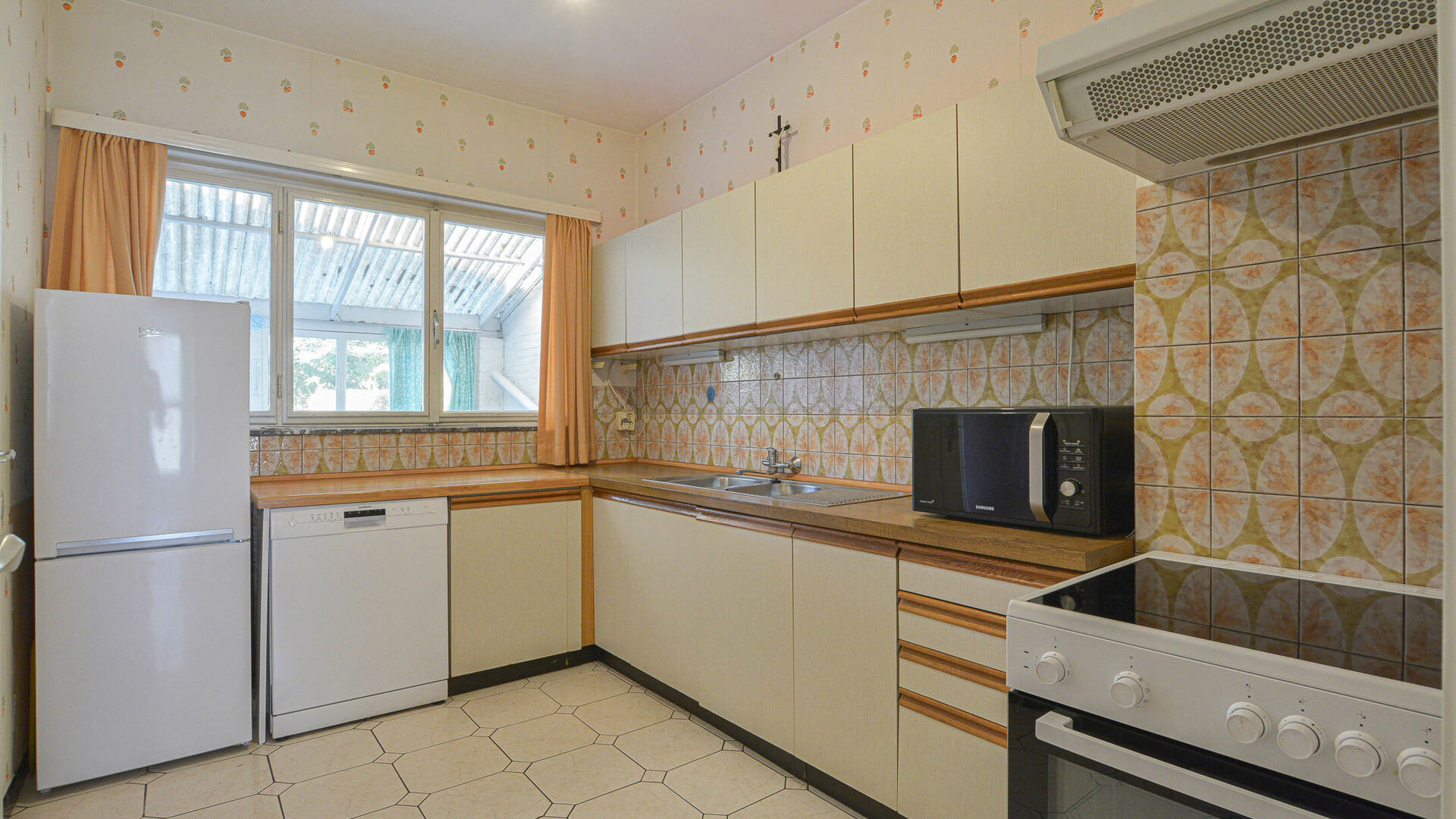 Ground floor: Entrance hall with guest toilet, bright living and dining room of +/-30 m², veranda with access to the garden and terrace, spacious fully equipped kitchen.