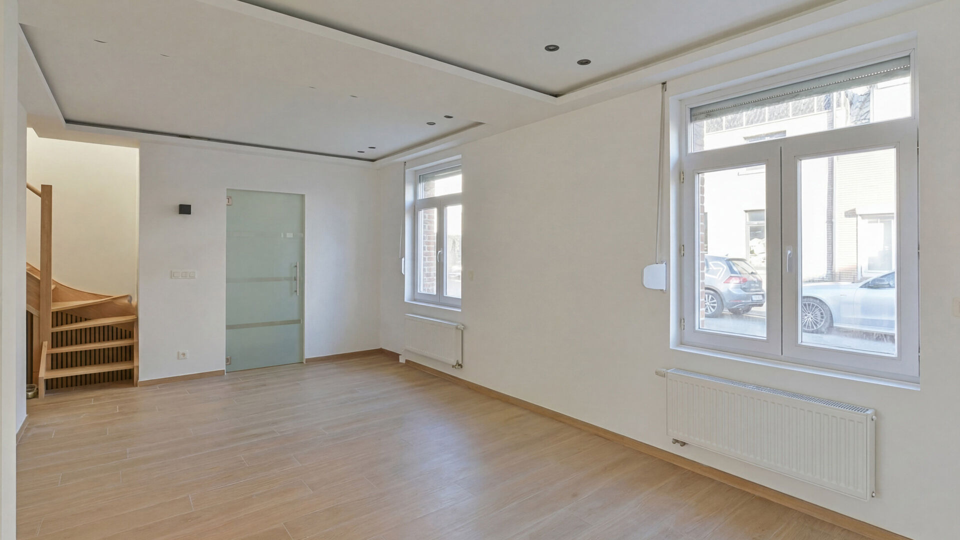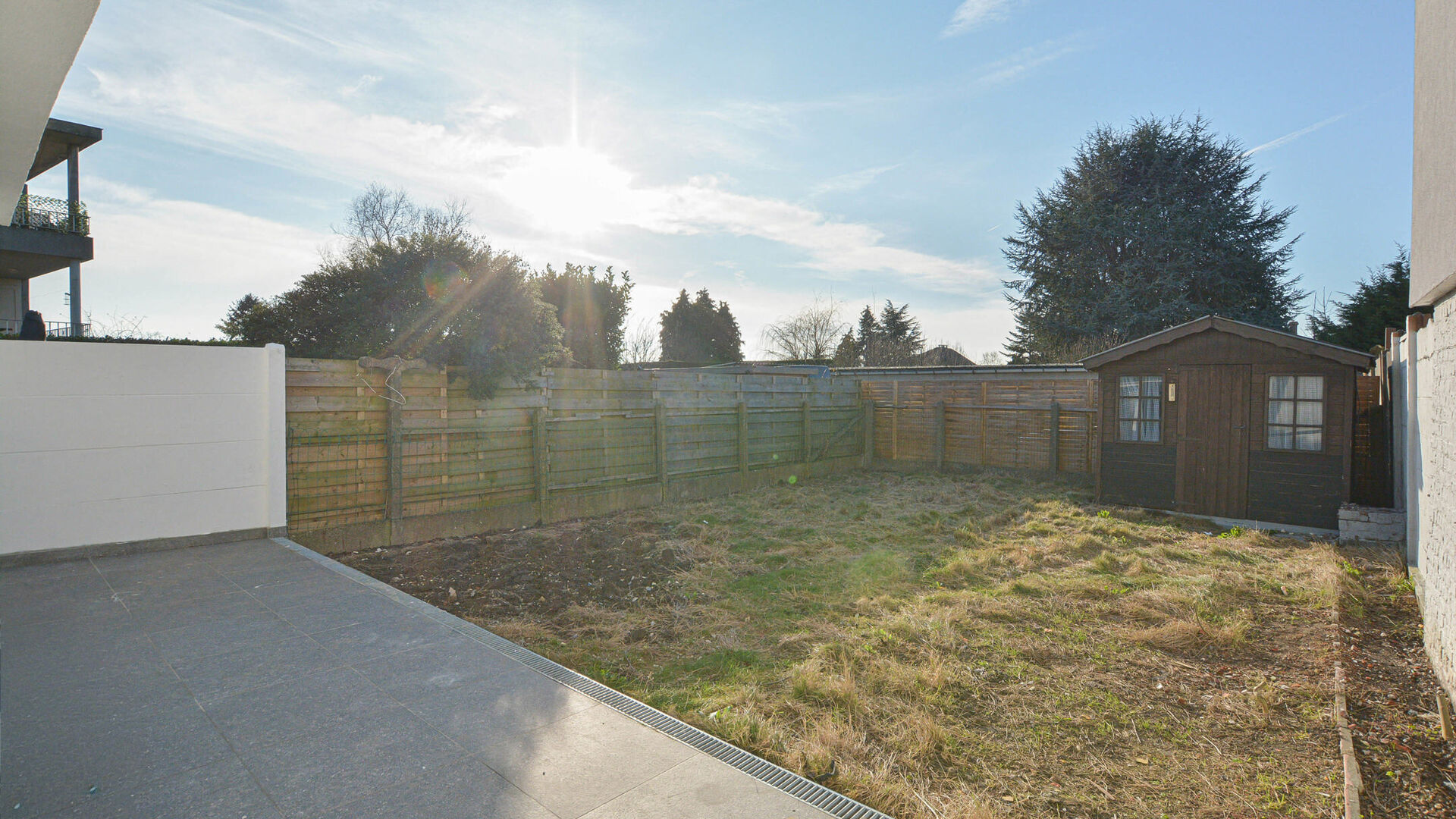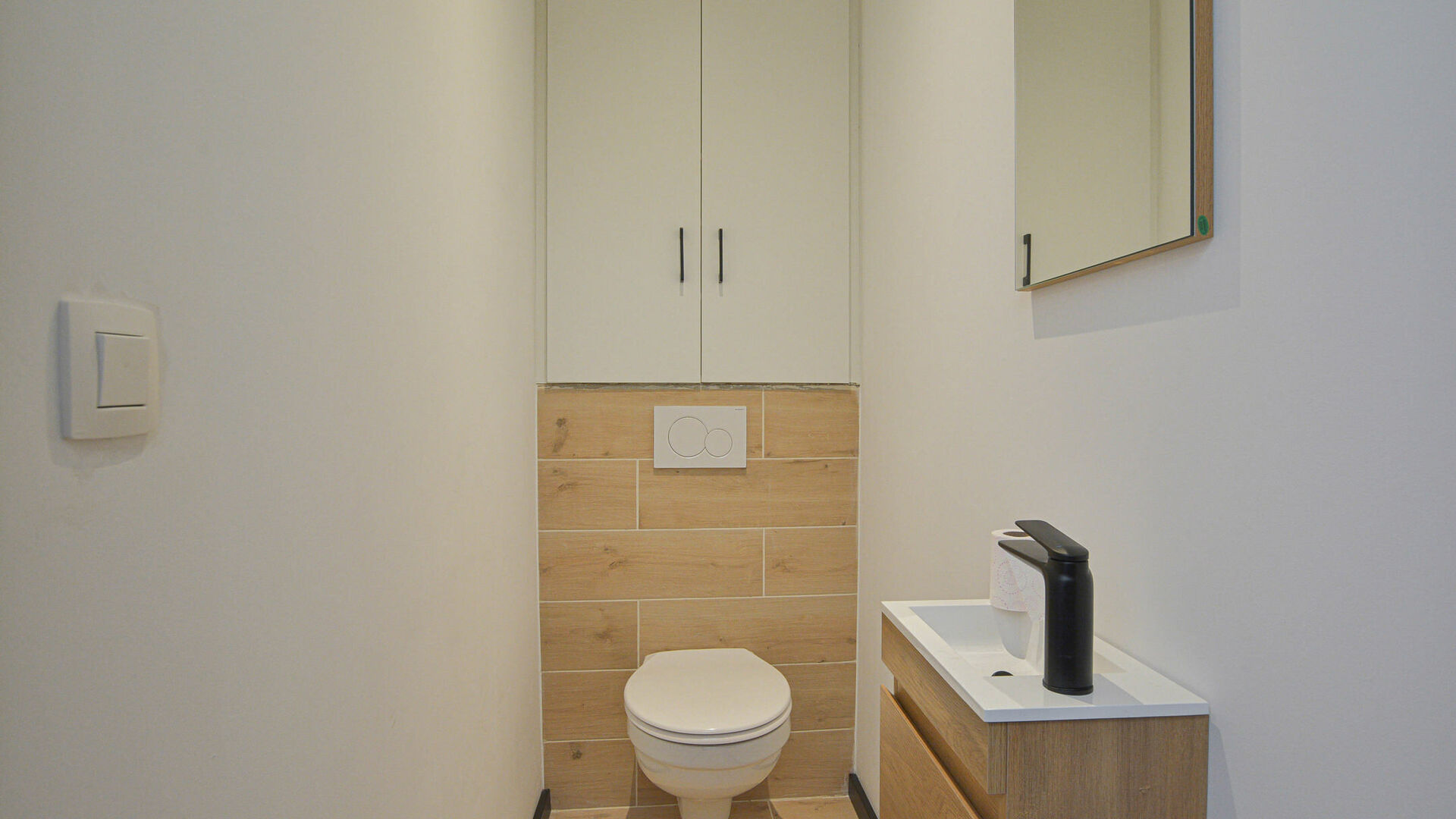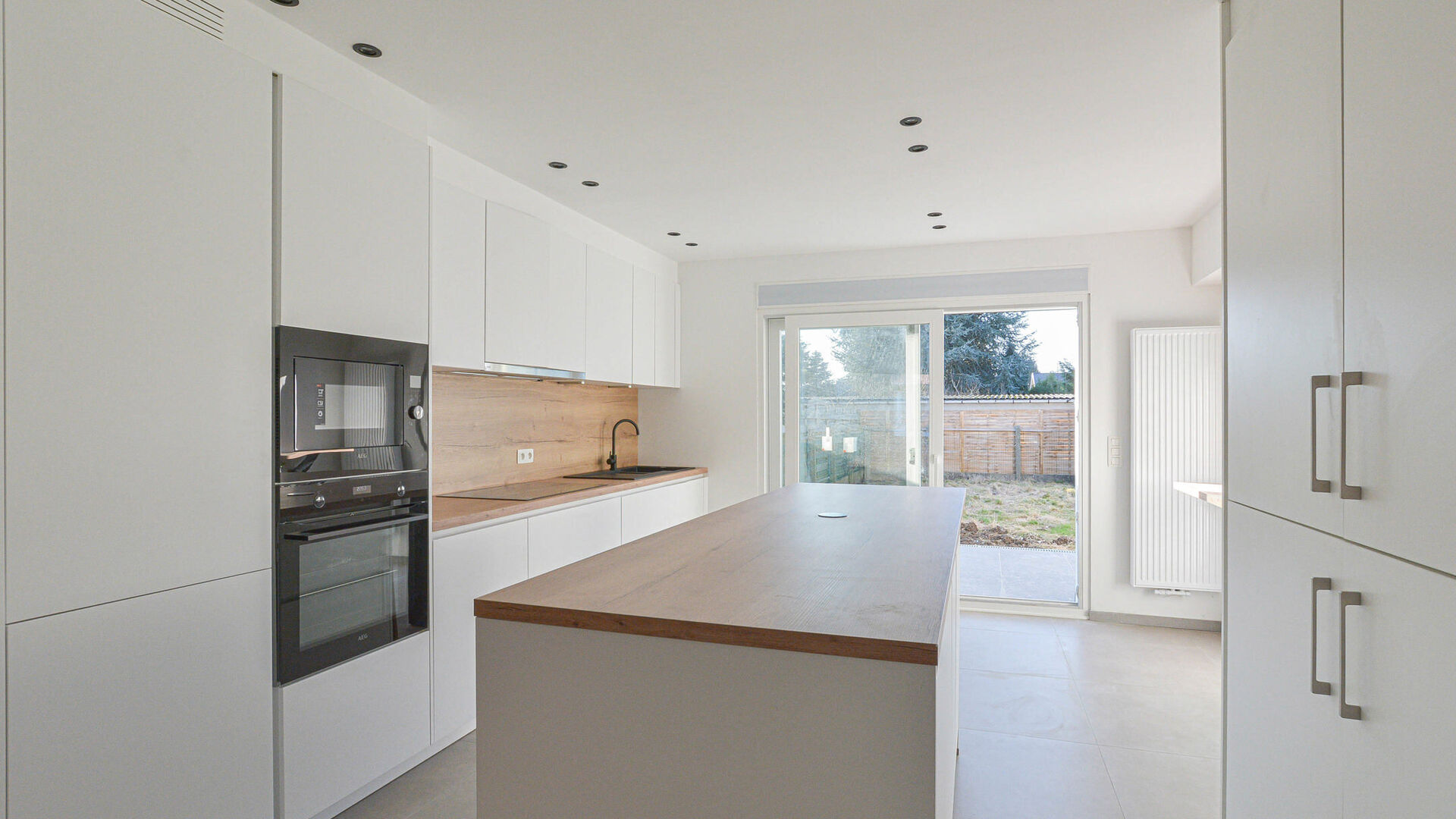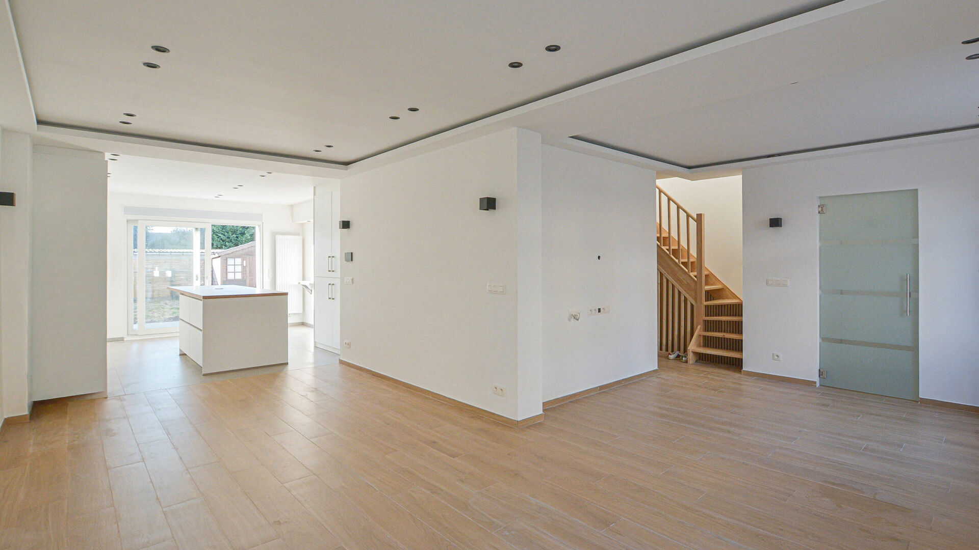 - Ground floor: entrance hall with built-in cloakroom, spacious living and dining room of +/-37 m², beautiful fully equipped open kitchen with central cooking island and access to the garden with adjoining terrace and garden shed. There is also a separate toilet, a first bedroom of +/-14 m², and a bathroom with walk-in shower and sink.