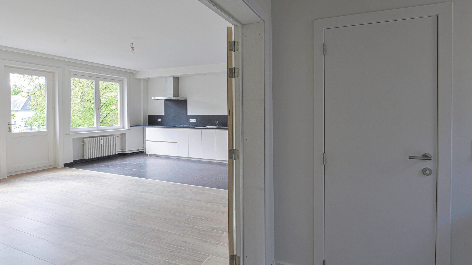 Upstairs, you will discover a beautiful fully renovated apartment of approximately 98 m². It features an entrance hall with a built-in closet and separate toilet, a bright living room with a fully equipped open kitchen (induction hob, oven, microwave, fridge, freezer, dishwasher) of approximately 30 m², two bedrooms with built-in wardrobes (±12.6 m² and ±18 m²), as well as a modern shower room with one sink.