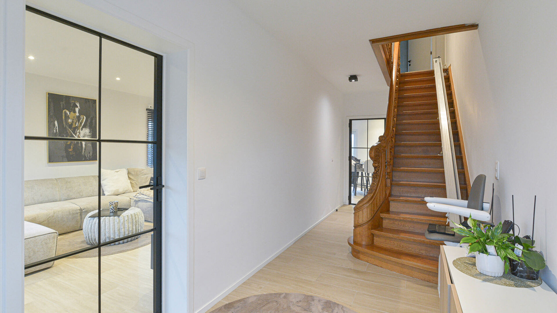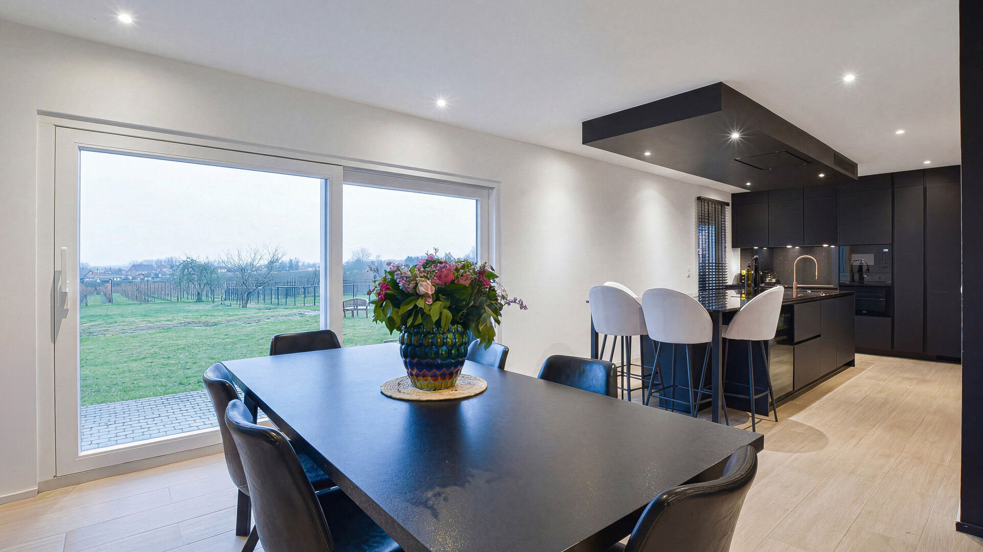 -Ground floor: Entrance hall with guest toilet and space for a wardrobe, large living and dining room of +/- 40 m² with a pellet stove, giving access to a large southwest-facing terrace. The adjoining garden of +/- 900 m² includes a garden house. Fully equipped open kitchen with central cooking island. The ground floor also includes a garage for one car, two outdoor parking spaces, a laundry room, and a storage area.