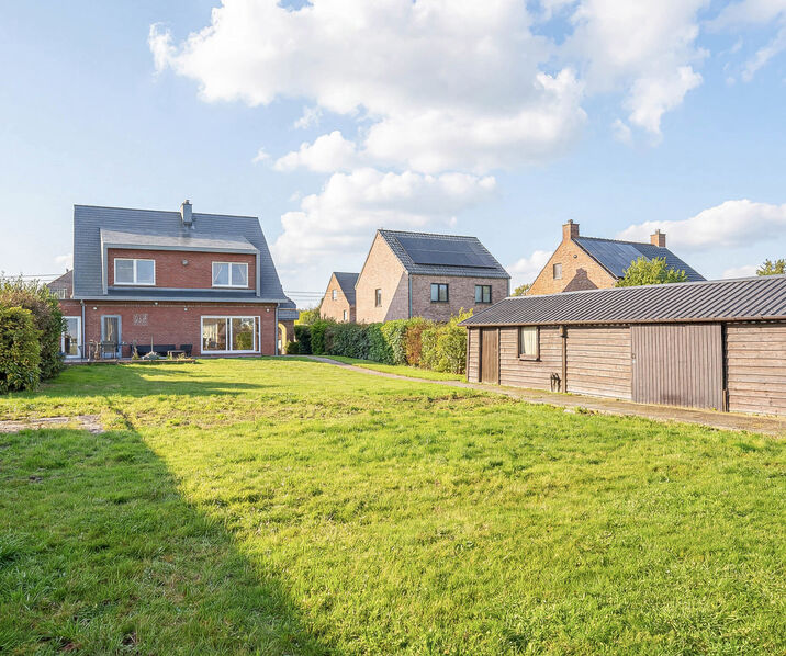 -Ground floor: Entrance hall with guest toilet and space for a wardrobe, large living and dining room of +/- 40 m² with a pellet stove, giving access to a large southwest-facing terrace. The adjoining garden of +/- 900 m² includes a garden house. Fully equipped open kitchen with central cooking island. The ground floor also includes a garage for one car, two outdoor parking spaces, a laundry room, and a storage area.