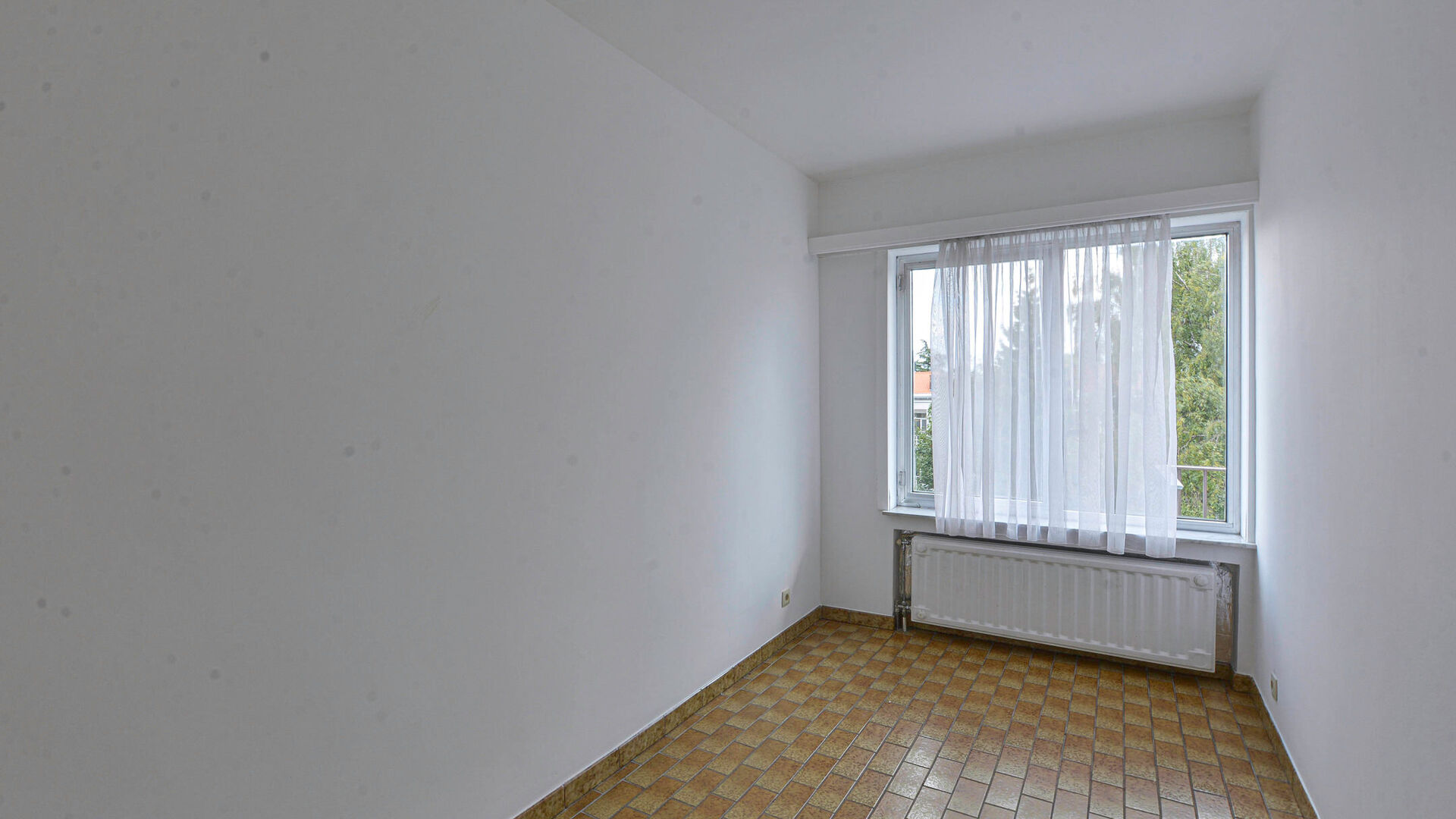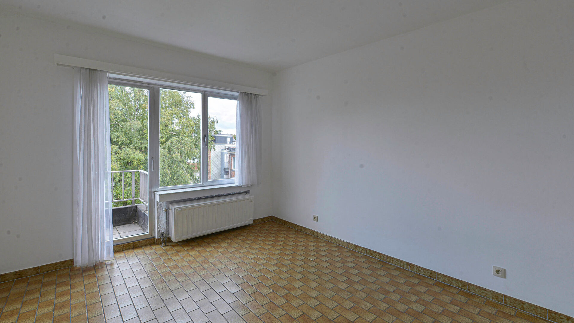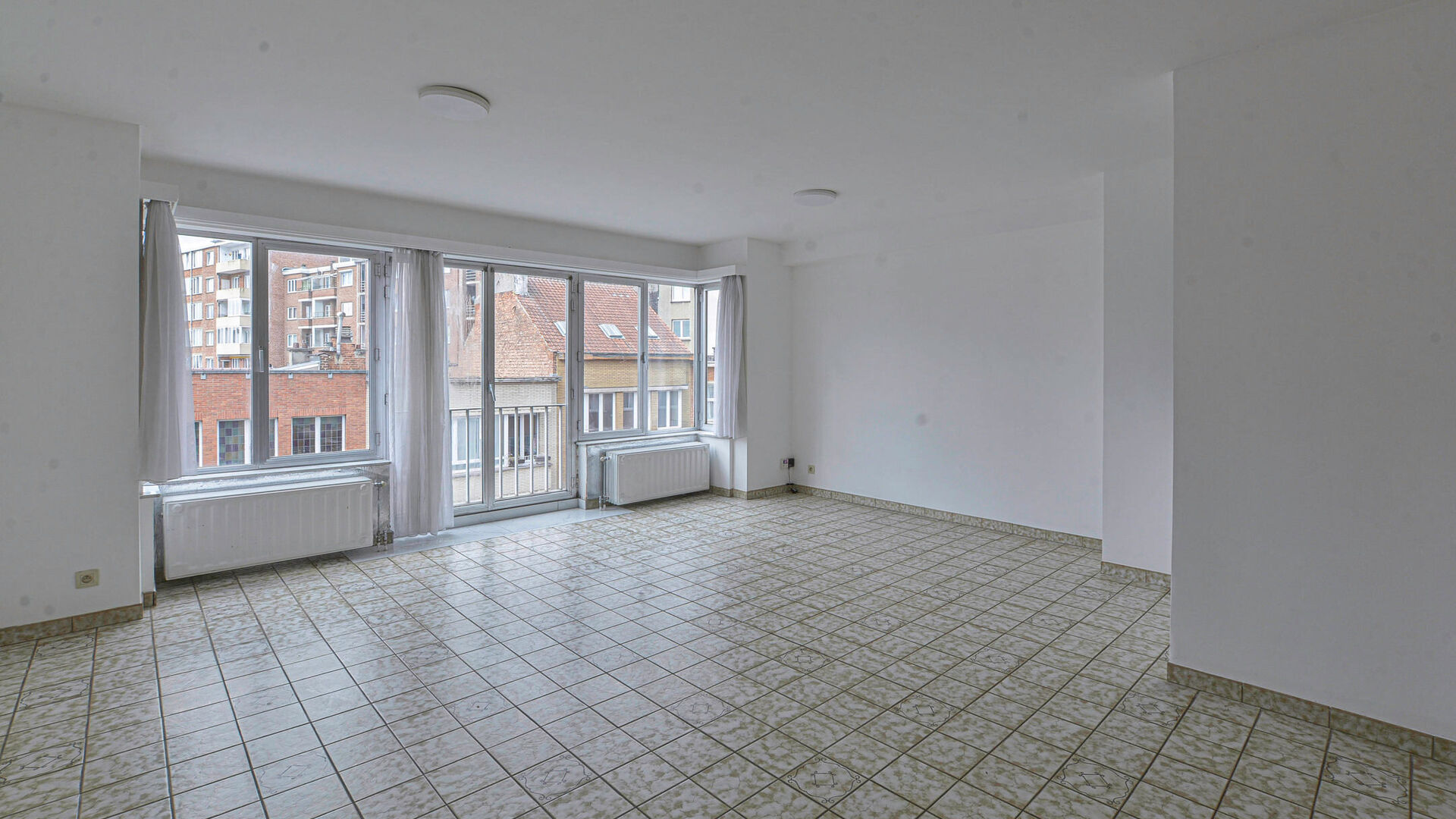 Hall d'entrée avec vestiaire // séjour lumineux +/-26m² // cuisine non équipée (seulement taques au gaz) // hall de nuit avec WC séparé et débarras // 2 chambres à coucher +/- 9m² et 14m² dont la plus grande donne accès au balcon // salle de bain (baignoire, évier, et emplacement machine à laver).