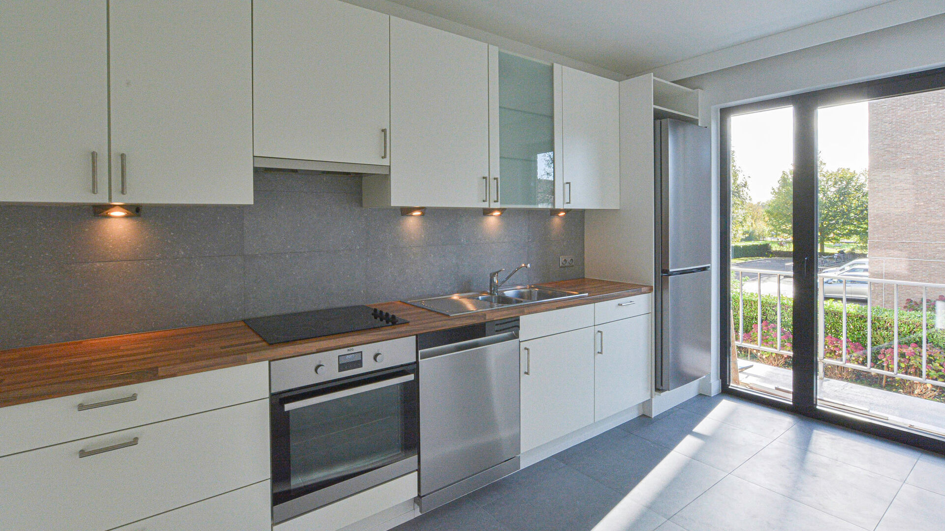 Hall d'entrée avec WC séparé et vestiaire // séjour lumineux +/- 31,6m² donnant accès à une 1e terrasse // cuisine équipée (taques électrique, four, lave-vaisselle, frigo et congélateur) donnant accès à une 2e terrasse // hall de nuit avec placard // 1e chambre +/- 13,4m² // 2e chambre +/- 11m² avec un évier // 3e chambre/bureau +/- 9m² avec accès à un balcon // salle de bain avec baignoire, évier et espace buanderie (en cours de rénovation) // cave //