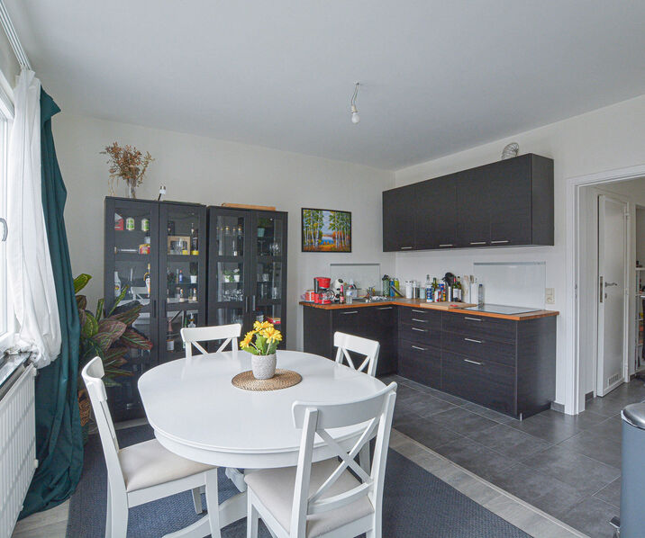 Hall d'entrée avec toilette séparée, séjour-salle à manger +/-20m² avec une cuisine ouverte super équipée (taques, four, lave-vaisselle, frigo/congélateur), 2 chambres +/- 14m-11m², salle de bain équipée d'une douche à l'italienne, évier et emplacement machine à laver.