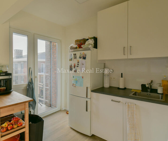 Cet appartement situé au 4e étage de +/- 65m² se compose comme suit: Hall d'entrée +/- 4m² avec wc séparée // lumineux séjour/salle à manger +/- 27m² // cuisine équipée (taque induction, lave vaisselle, frigo, four...) qui donne accès au balcon // 1 chambre à coucher +/- 14m² // salle de douche avec évier // cave // emplacement dans le parking souterrain.