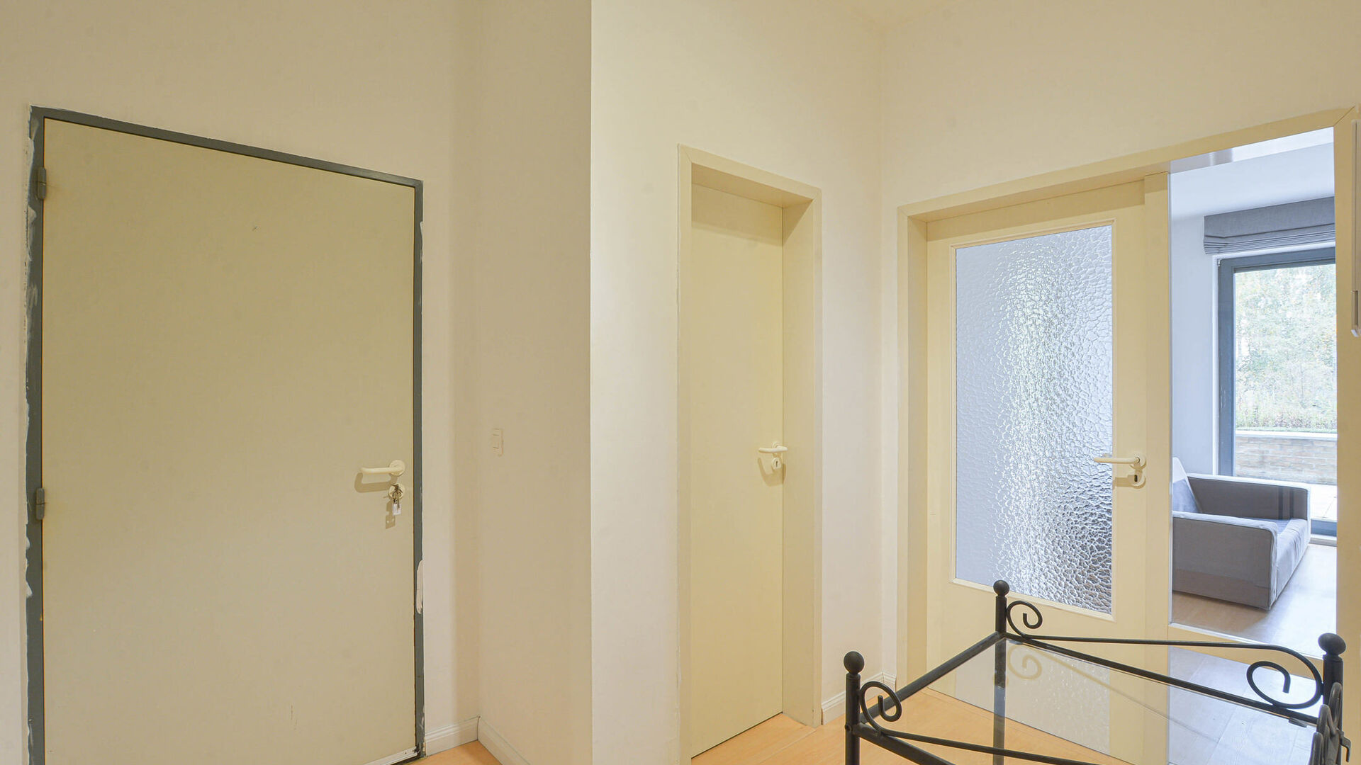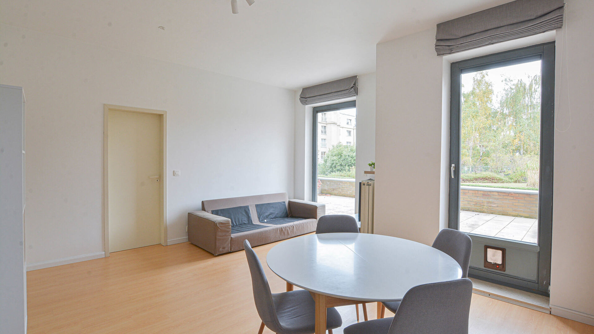 Hall d’entrée avec vestiaire intégré et toilette séparée, salle de bain avec baignoire et lévier, lumineux séjour-salle à manger de ±21 m² donnant accès à une spacieuse terrasse, cuisine entièrement équipée avec coin débarras/local technique et la chambre à coucher de ±14 m².