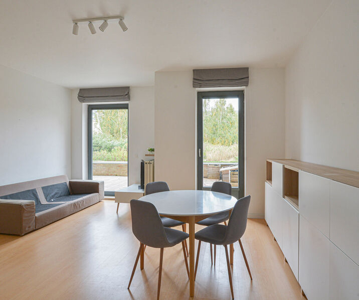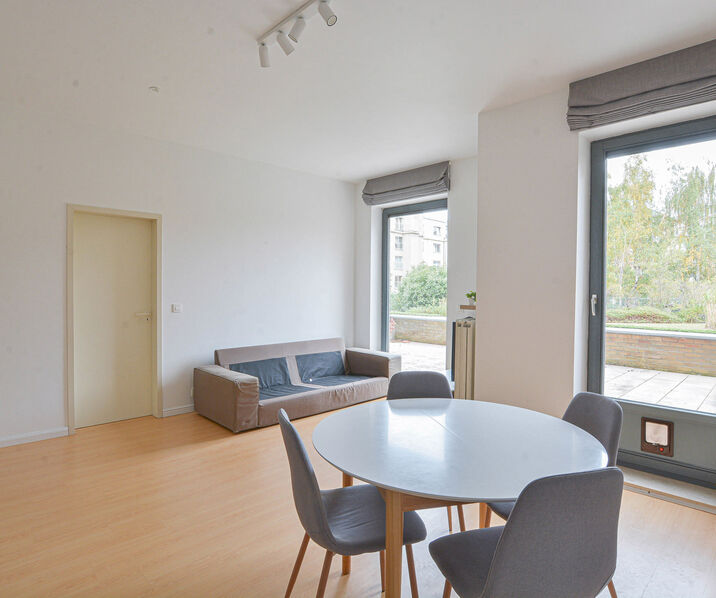 Hall d’entrée avec vestiaire intégré et toilette séparée, salle de bain avec baignoire et lévier, lumineux séjour-salle à manger de ±21 m² donnant accès à une spacieuse terrasse, cuisine entièrement équipée avec coin débarras/local technique et la chambre à coucher de ±14 m².