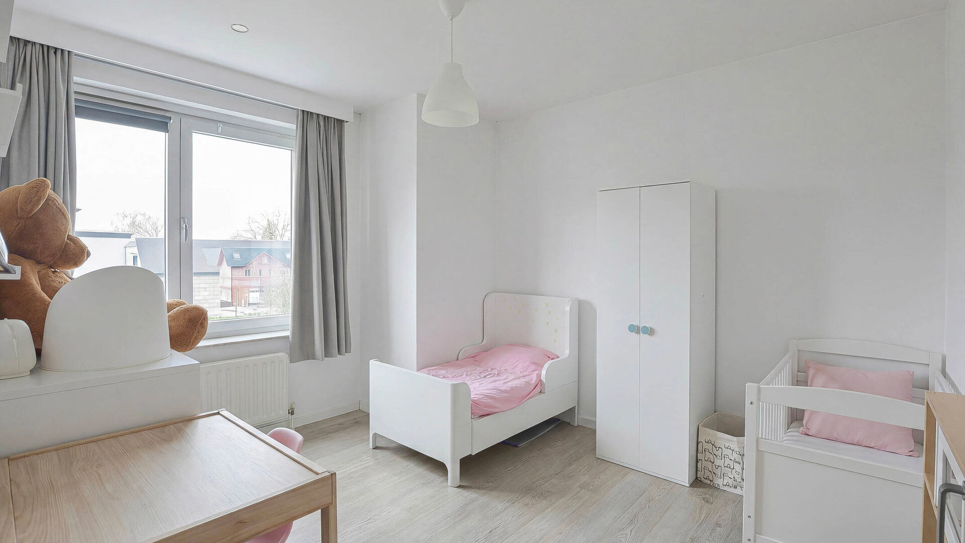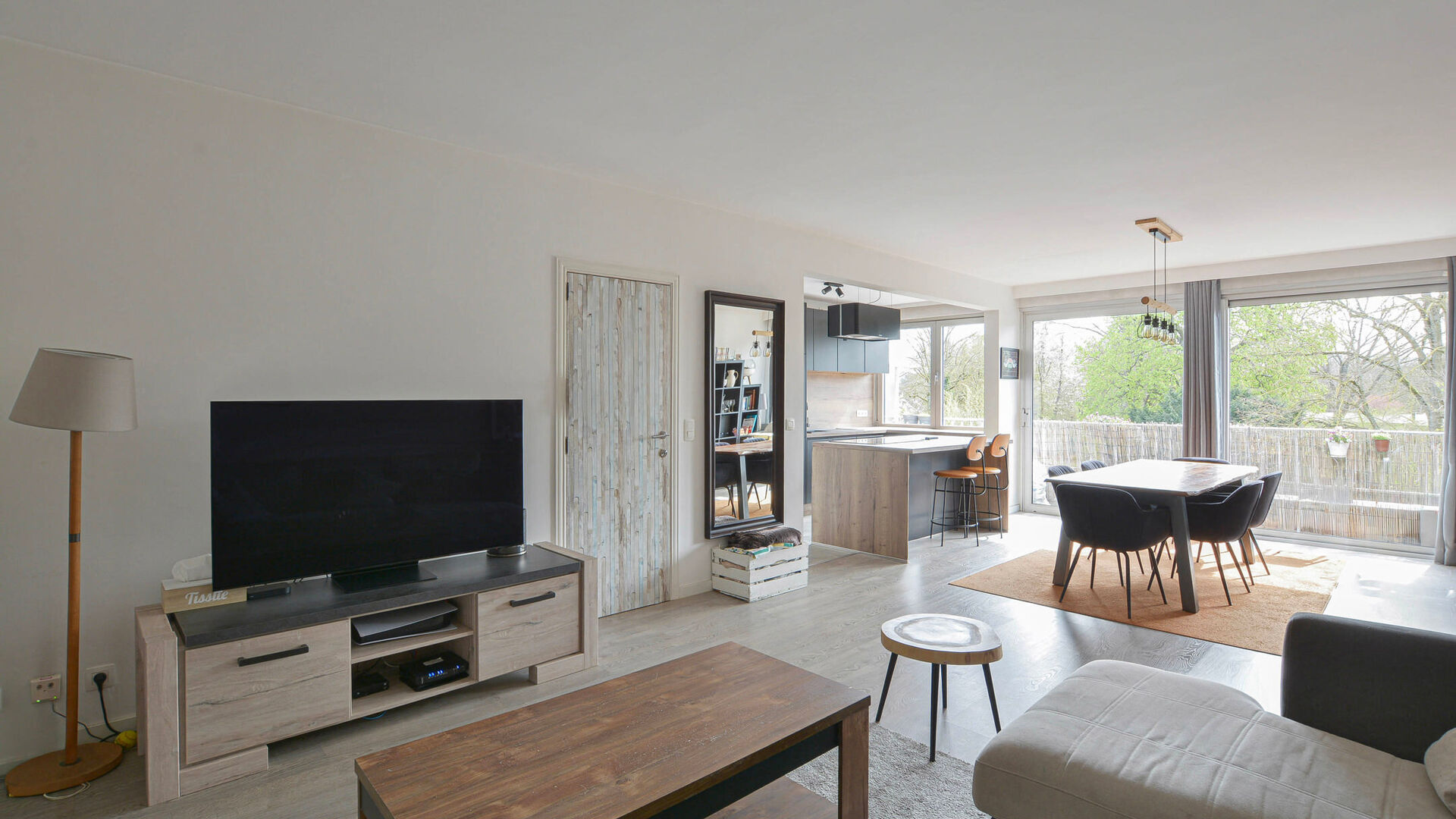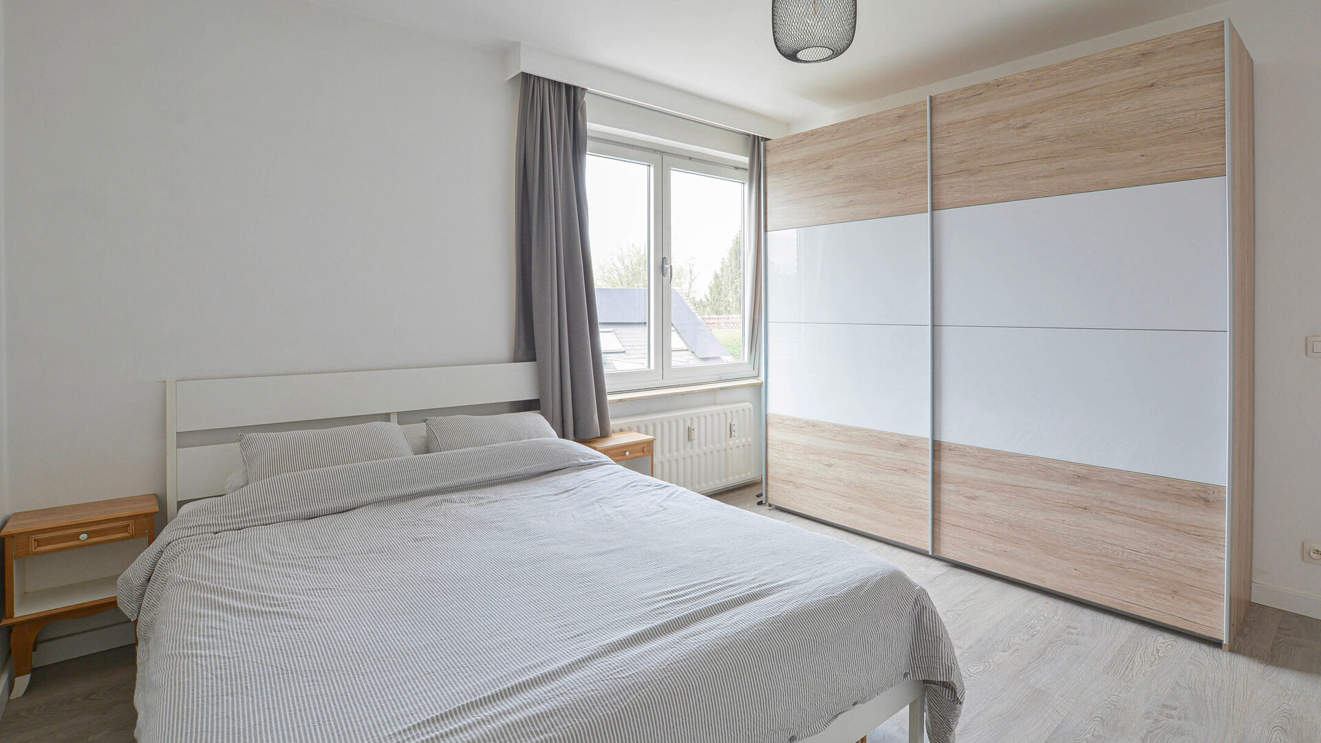 Hall d’entrée avec vestiaire et débarras avec raccordements pour machine à laver/sèche-linge. Lumineux séjour-salle à manger de 36m² donnant accès à une terrasse orientée sud, cuisine ouverte entièrement équipée avec îlot central/coin petit-déjeuner. Hall de nuit avec WC, 2 chambres à coucher de +/-15 et 12m² et salle de bain avec baignoire et lavabo.
