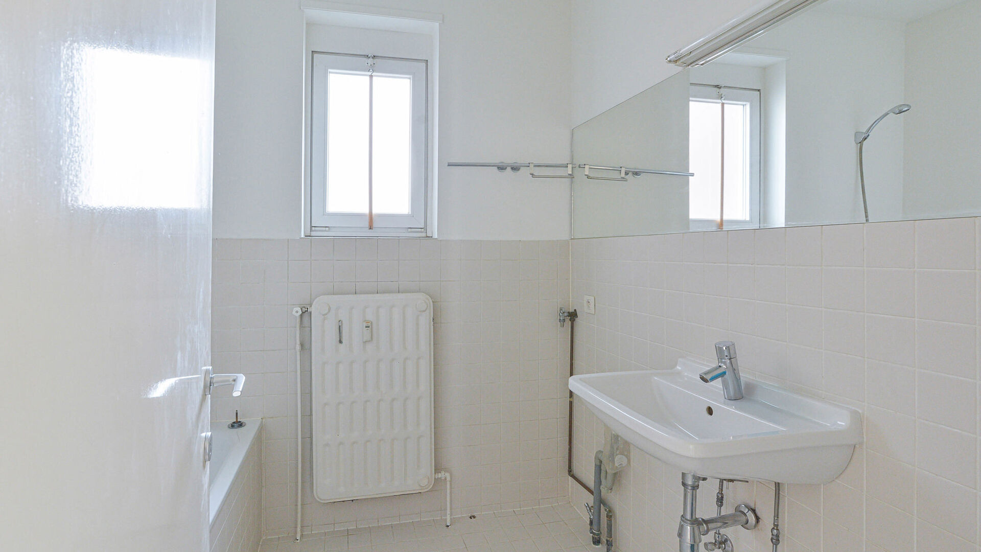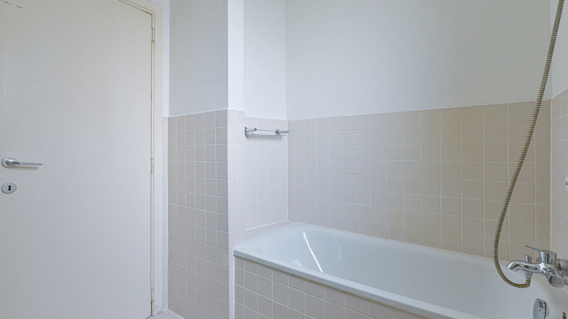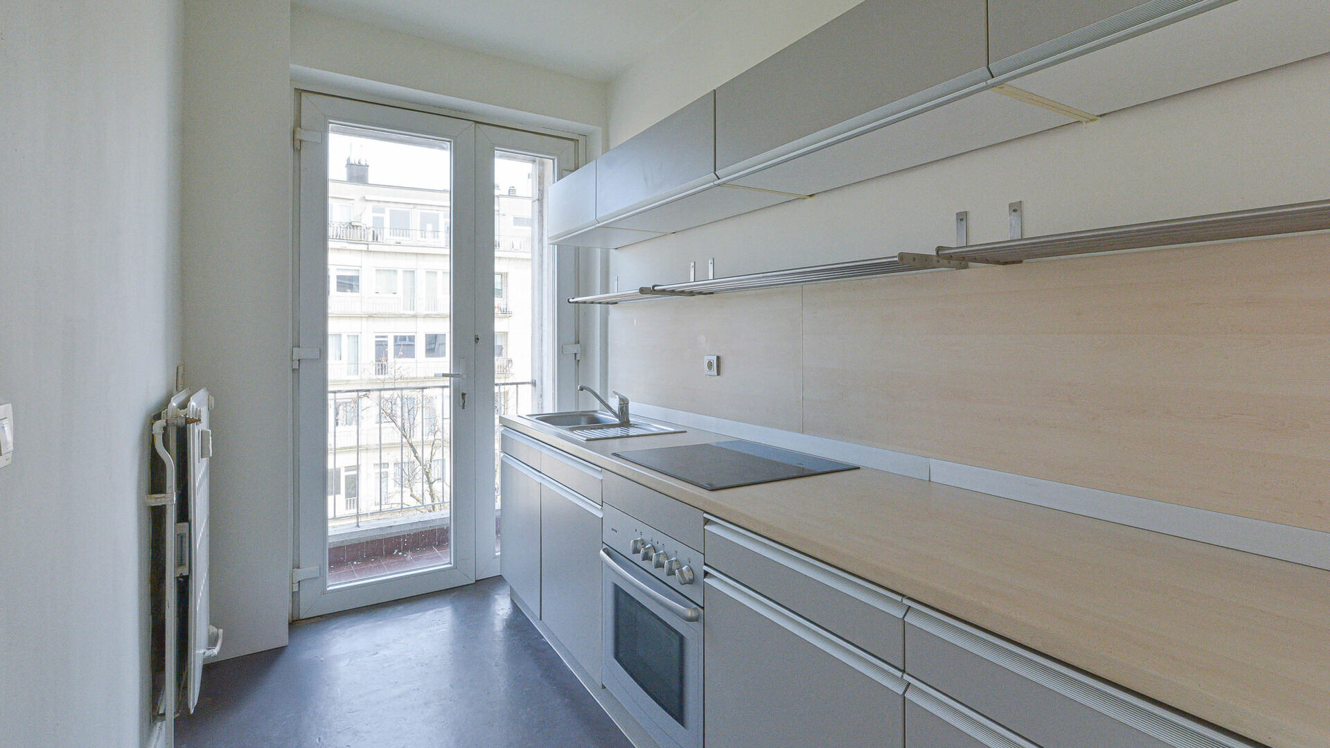 Hall d’entrée ±4 m² avec toilette séparée // séjour lumineux ±25,5 m² donnant accès à la cuisine fermée ±6 m² (équipée d’une plaque à induction, four, lave-vaisselle) avec espace de rangement et placards intégrés, et accès à un balcon orienté est // deux chambres : première chambre ±12 m² accessible par le hall de nuit, seconde chambre ±10m² accessible depuis le séjour // salle de bains avec baignoire, lavabo et raccordement pour machine à laver //