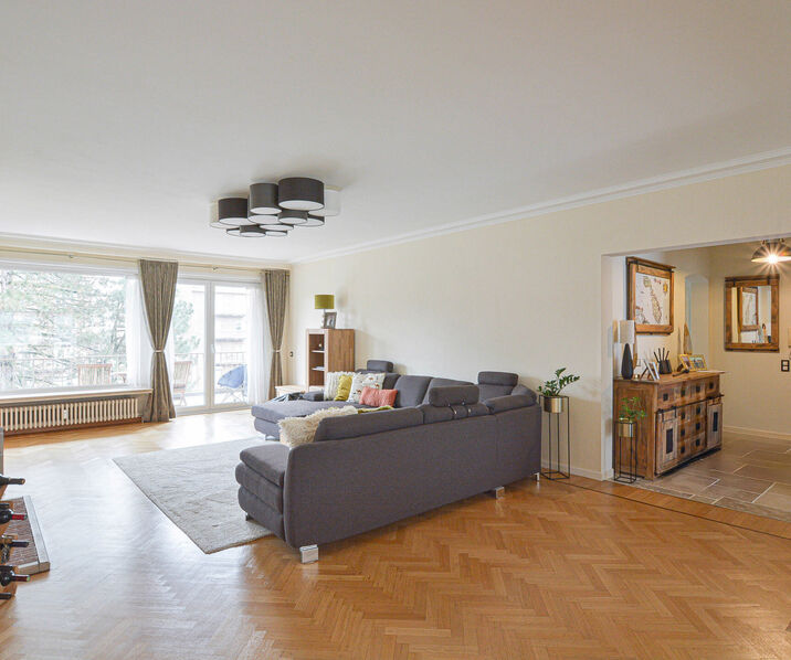 Cet appartement spacieux et rénové avec goût de +/- 152m² (selon PEB) est situé au 4e étage et se compose comme suit : Spacieux hall d’entrée avec vestiaire intégré, lumineux séjour et salle à manger de +/- 60m² avec cassette a bois et accès à deux grandes terrasses (SUD/NORD), dont la terrasse orientée sud de +/- 15m² offrant une vue dégagée sur les jardins environnants. Nouvelle cuisine entièrement équipée (taque de cuisson, four avec micro-ondes, four à vapeur lave-vaisselle, réfrigérateur/congélateur) avec coin petit-déjeuner. Hall de nuit avec toilette séparée, chambre parentale de +/- 16m² avec salle de bain attenante (douche et évier) et accès à la terrasse orientée sud, 2 chambres à coucher de +/- 11-10m², nouvelle salle de bain (baignoire avec douche, évier), espace de rangement avec raccordement pour machine à laver/séchoir.