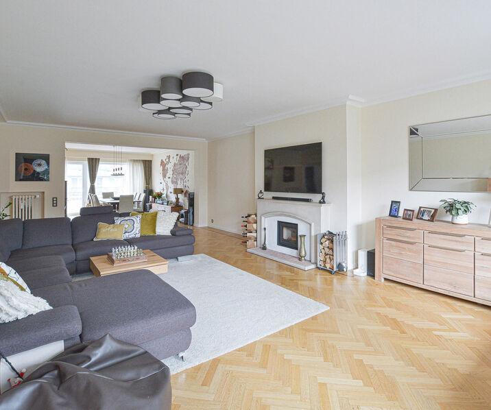 Cet appartement spacieux et rénové avec goût de +/- 152m² (selon PEB) est situé au 4e étage et se compose comme suit : Spacieux hall d’entrée avec vestiaire intégré, lumineux séjour et salle à manger de +/- 60m² avec cassette a bois et accès à deux grandes terrasses (SUD/NORD), dont la terrasse orientée sud de +/- 15m² offrant une vue dégagée sur les jardins environnants. Nouvelle cuisine entièrement équipée (taque de cuisson, four avec micro-ondes, four à vapeur lave-vaisselle, réfrigérateur/congélateur) avec coin petit-déjeuner. Hall de nuit avec toilette séparée, chambre parentale de +/- 16m² avec salle de bain attenante (douche et évier) et accès à la terrasse orientée sud, 2 chambres à coucher de +/- 11-10m², nouvelle salle de bain (baignoire avec douche, évier), espace de rangement avec raccordement pour machine à laver/séchoir.