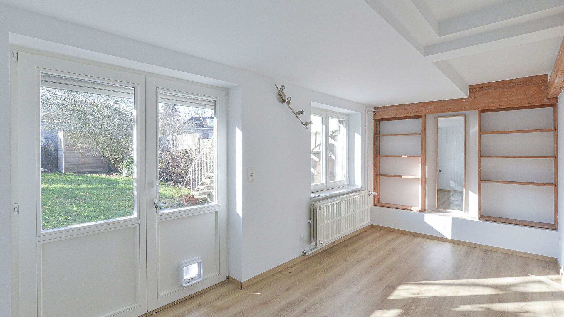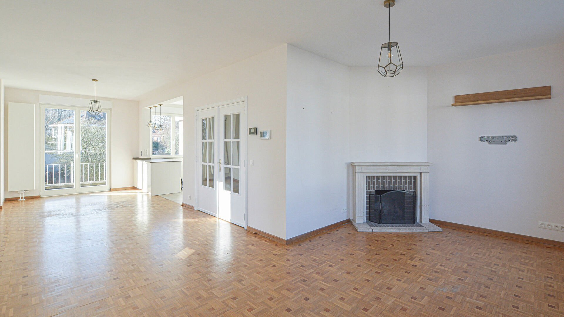 Lumineux séjour en L de +/-35 m² avec feu ouvert, cuisine ouverte super équipée avec coin à déjeuner, terrasse donnant accès au jardin orienté Sud-Ouest de +/-75 m² avec abri de jardin.