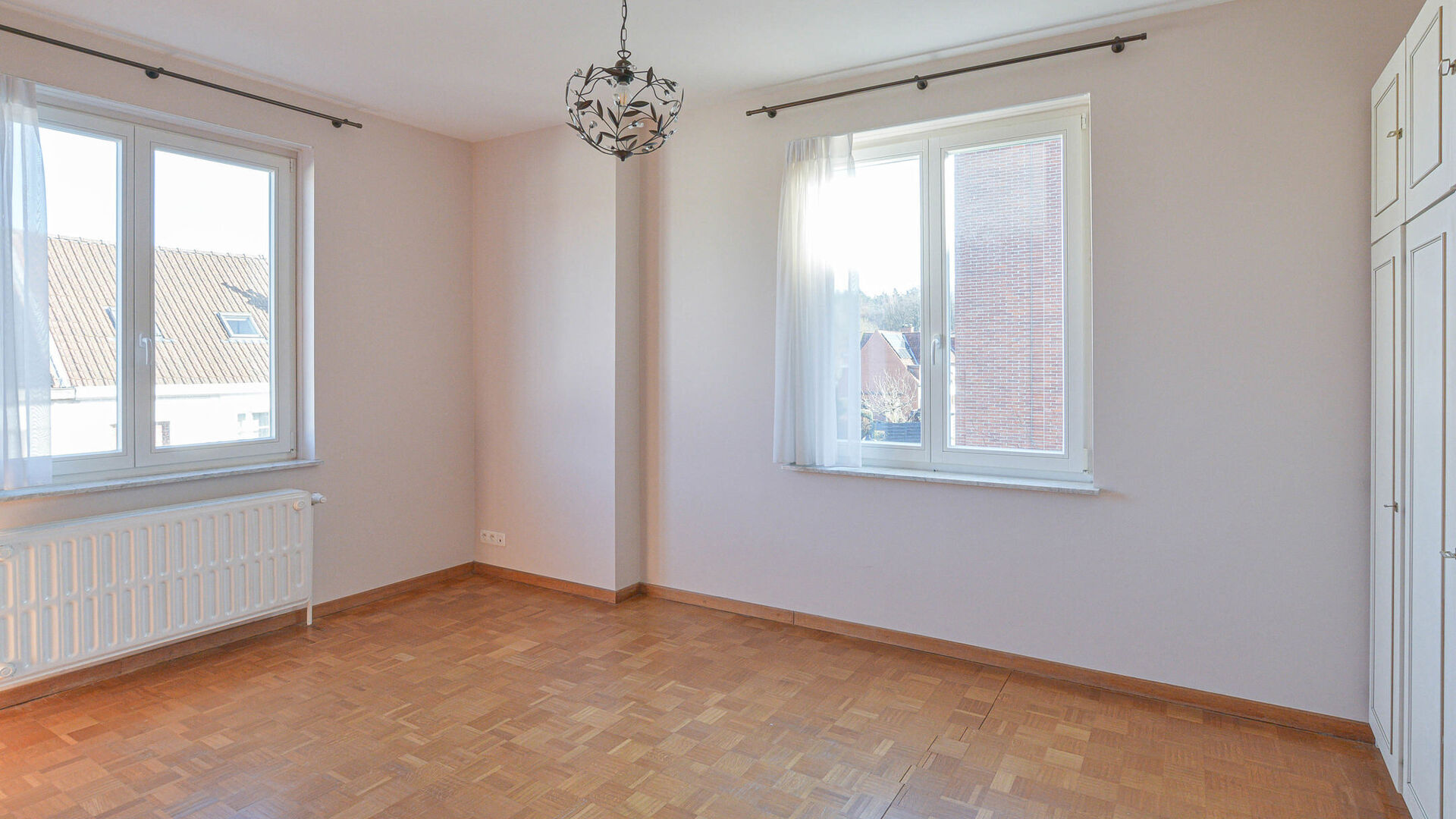 Chambre parentale de +/-15 m² avec placards intégrés, salle de douche avec évier et toilette séparée.