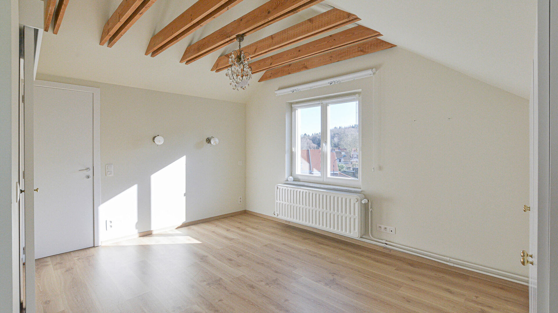 Trois chambres à coucher de +/-15-13-6m², ainsi qu’une salle de bains (baignoire avec douche, toilette et double éviers).