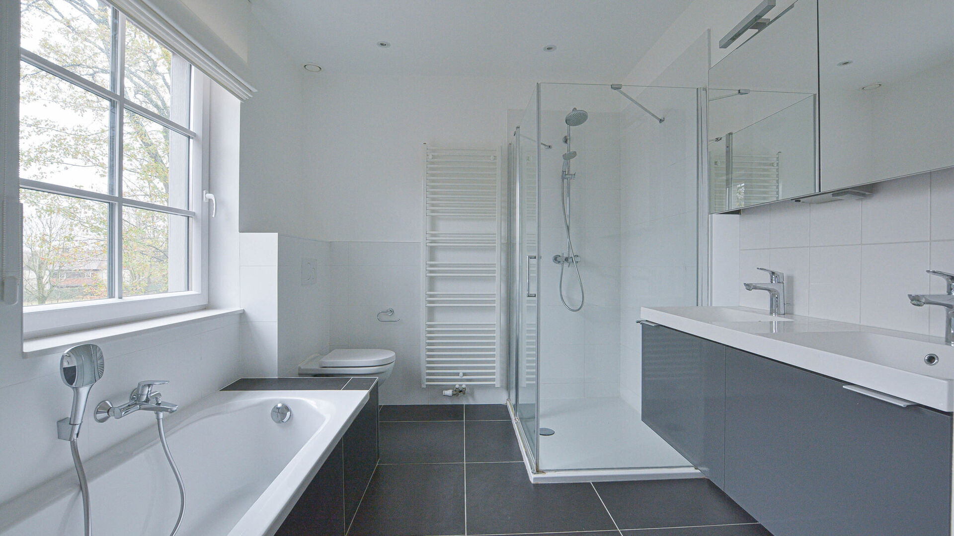 - 2e étage : Hall de nuit avec troisième toilette, deux chambres à coucher de +/-27-11m² et une 3ème salle de bains (baignoire, douche et double évier)
