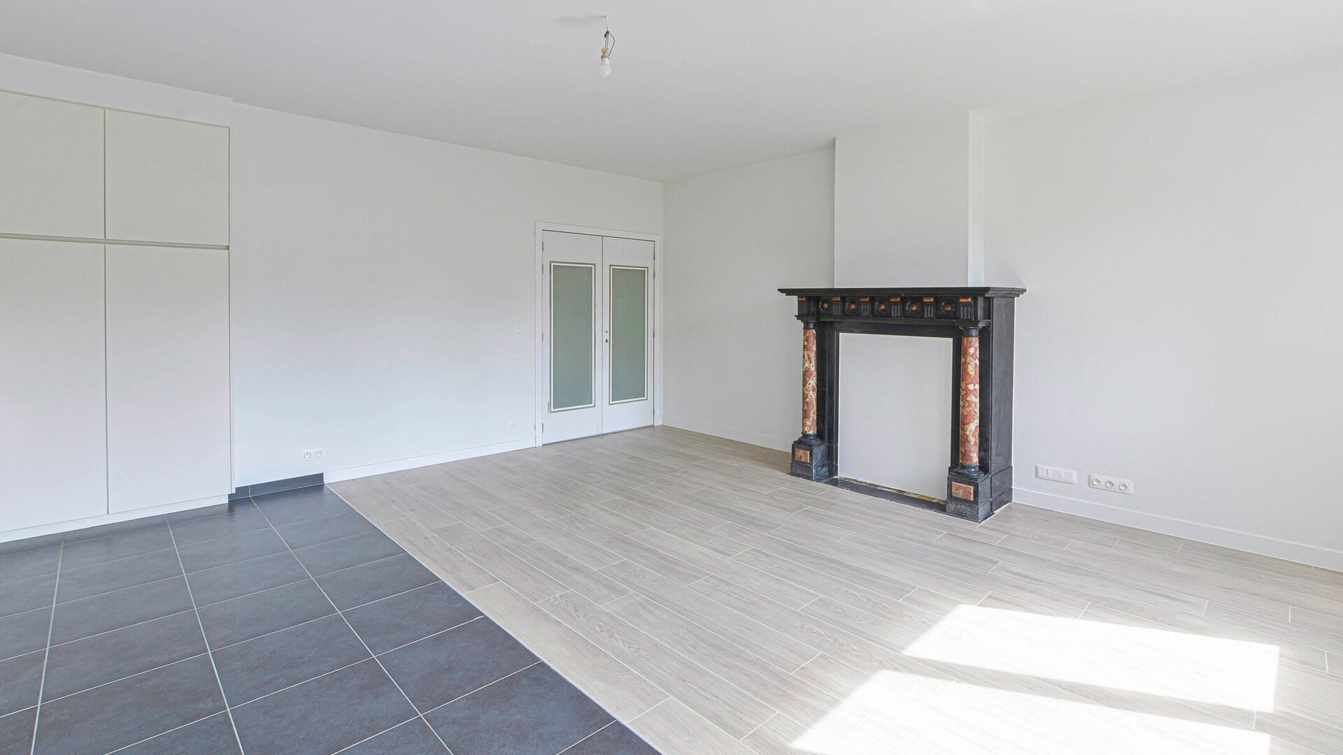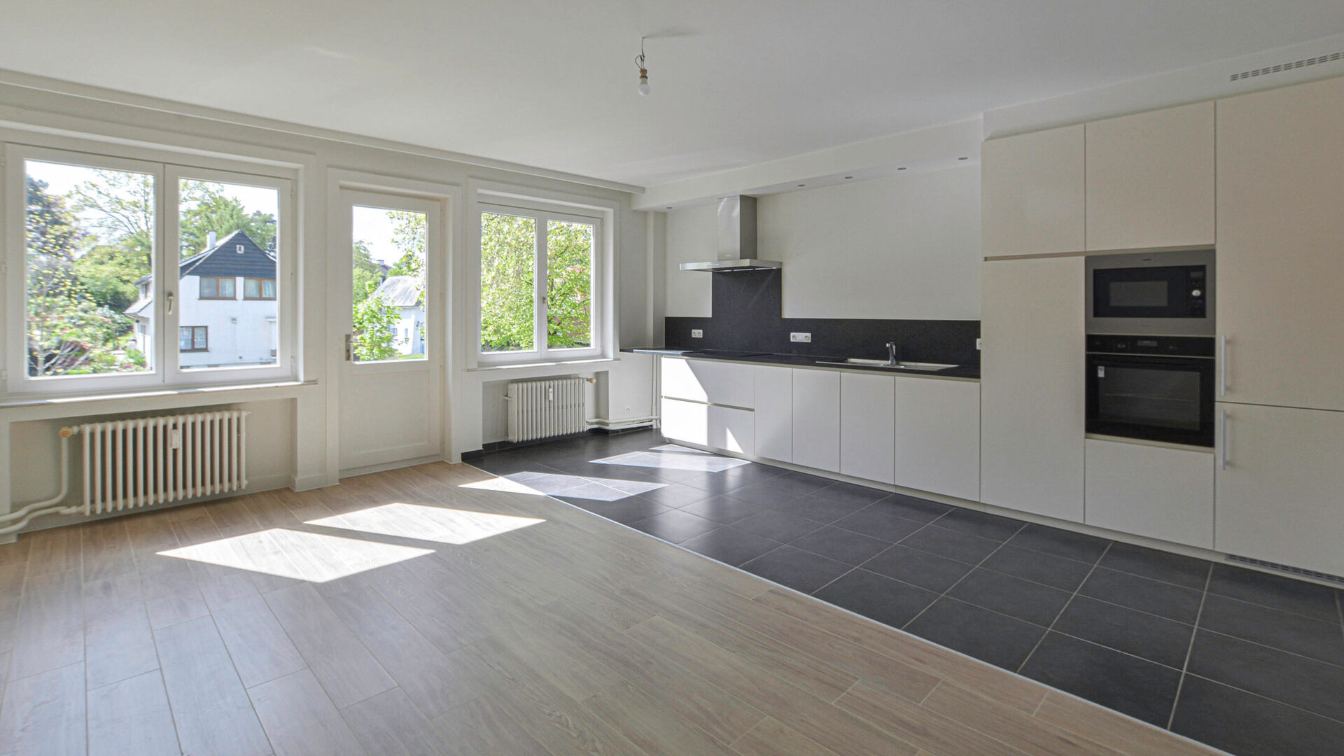 À l’étage, vous découvrirez un bel appartement entièrement rénové d’environ 98m². Il se compose d’un hall d’entrée avec placard intégré et WC séparé, d’un séjour lumineux avec cuisine ouverte entièrement équipée (taques à induction, four, micro-ondes, frigo, congélateur, lave-vaisselle) d’environ 30 m², de deux chambres avec placards intégrés (±12,6 m² et ±18 m²), ainsi que d’une salle de douche moderne avec un évier.
