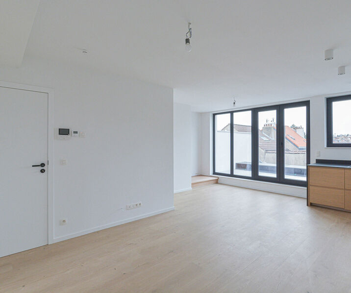 Situé dans un environnement calme, à proximité de la place Keym. L’appartement bénéficie d’un accès facile aux transports en commun, aux commerces et aux écoles, tout en offrant la proximité de la Forêt de Soignes, idéale pour ceux qui souhaitent allier tranquillité, nature et vie urbaine. Cet apparentièrement rénové de76m² est stiué au 2ᵉ et 3ᵉ étage d’un petit immeuble sans ascenseur et se composant de: Hall d’entrée avec toilette séparée, salle de bains (baignoire, évier et raccordement pour machine à laver), lumineux séjour-salle à manger de +/-28m² donnant accès sur une grande terrasse, une cuisine entièrement équipée. Première chambre/bureau de +/-10m², à létage on retrouve un espace de rangement, la deuxième chambre de +/-15 m² avec d’une salle de douche et toilette. Un garage box est compris dans le loyer.