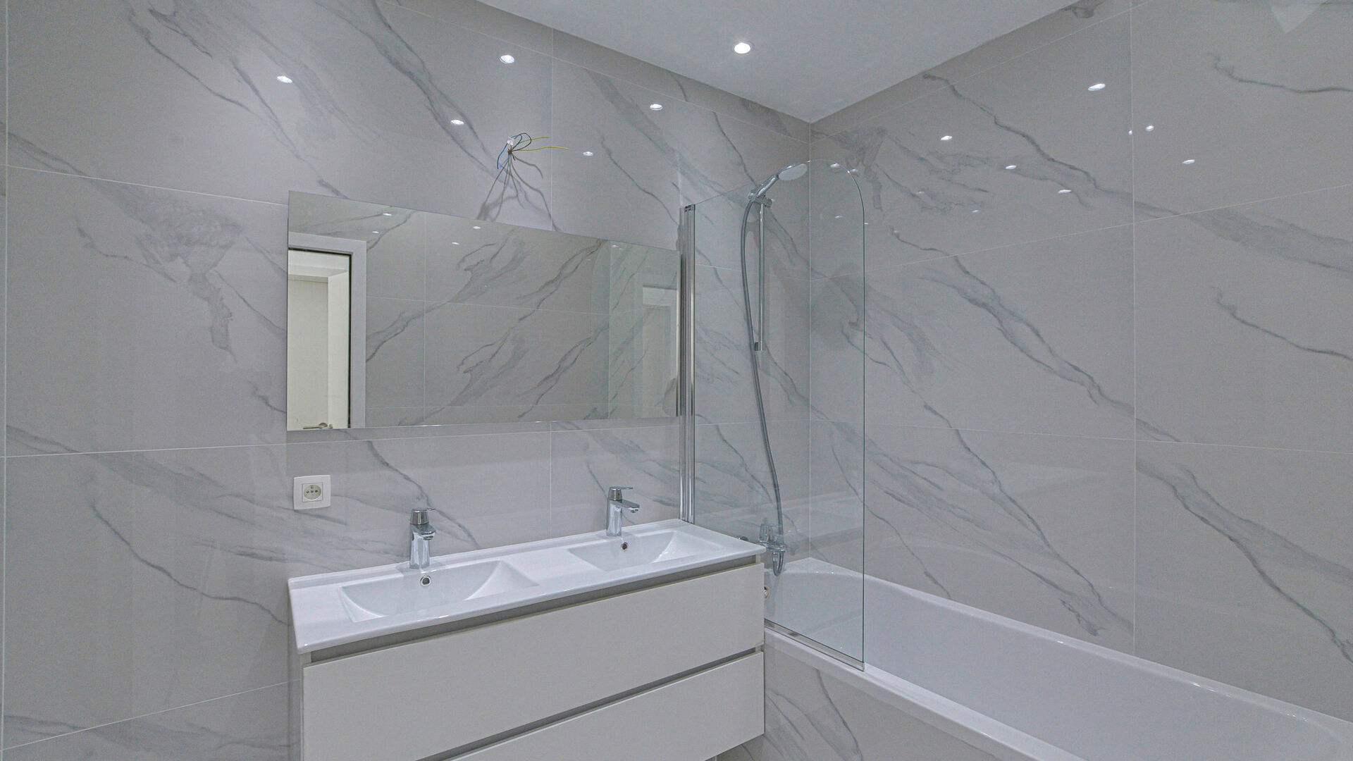 WC séparé // chambre parental +17m² // 2e chambre à coucher +/- 10m² avec mezzanine // 3e chambre à coucher +/- 10m² avec mezzanine // salle de bain avec baignoire, double évier et connexion machine à laver.