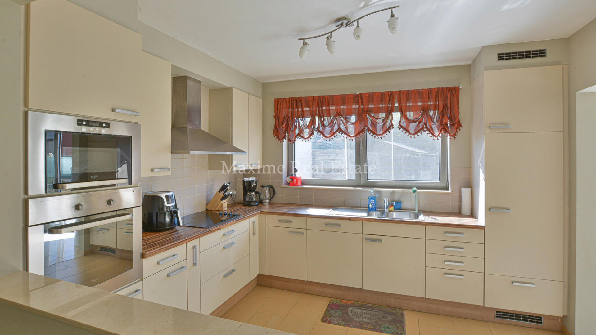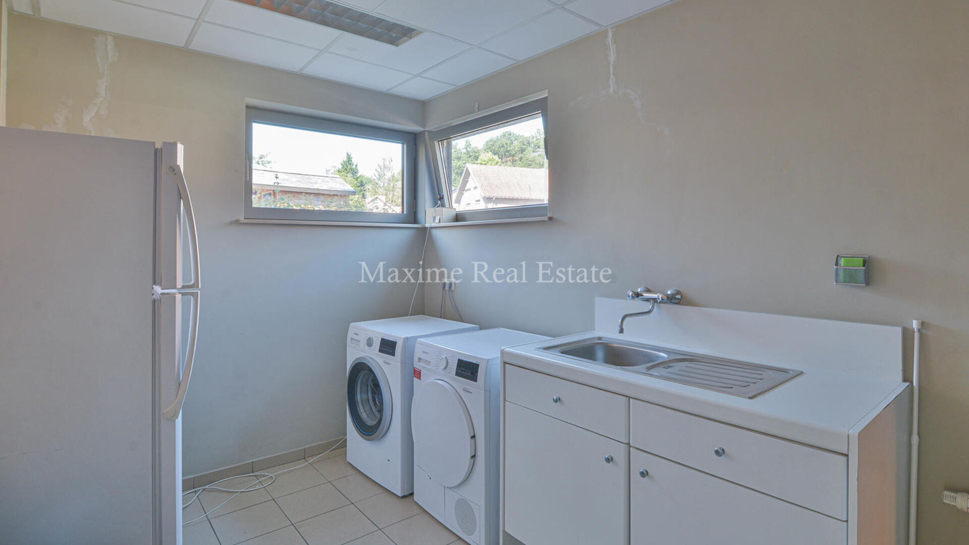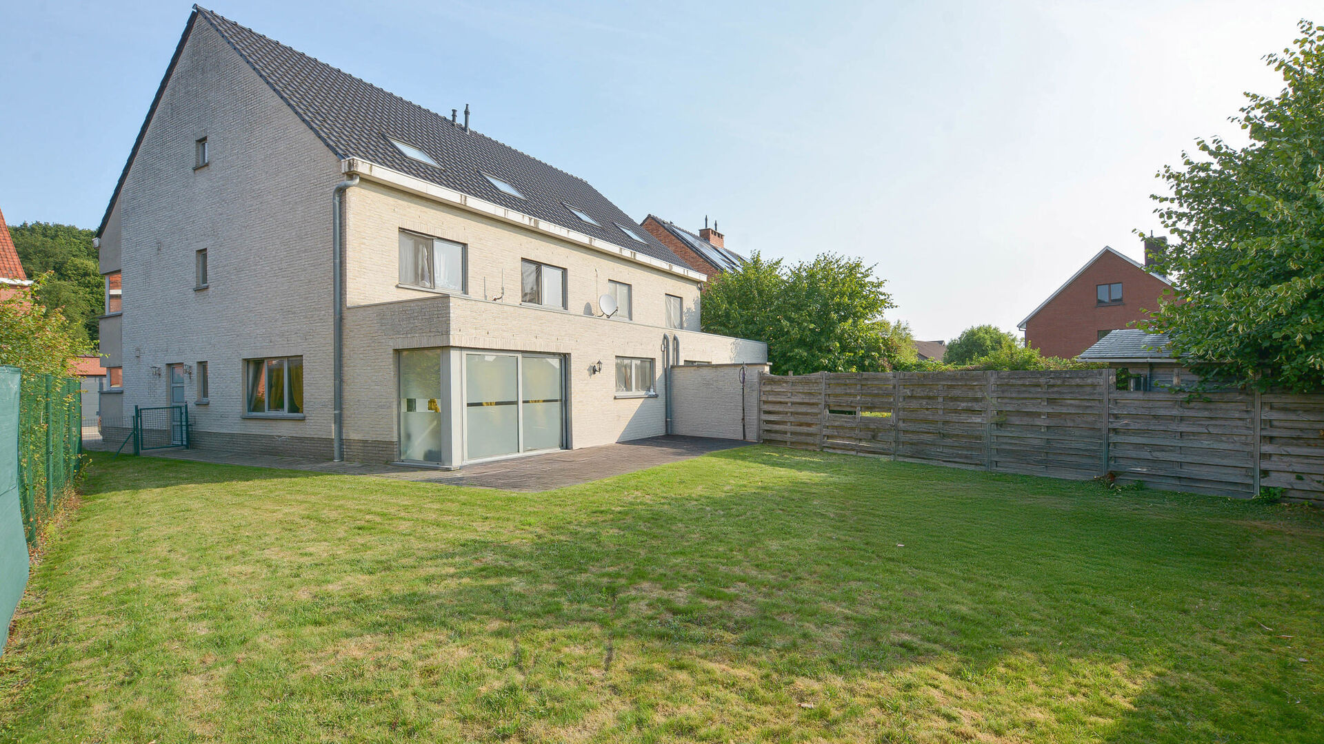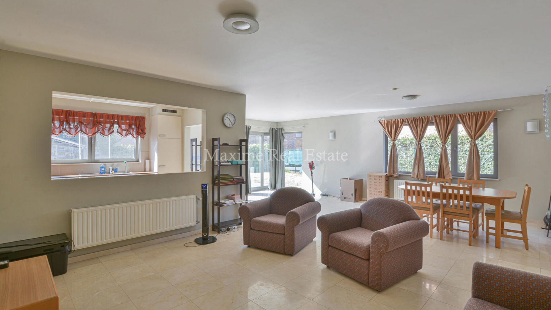 Rez-de-chaussée: Hall d'entrée avec toilette séparée et vestiaire, buanderie, garage pour 1 voiture + place de parkings dans l'allée, lumineux séjour-salle à manger lumineux de +/- 40m² donnant accès au jardin et à la terrasse (entièrement clôturé), cuisine entièrement équipée (taques, hotte,lave-vaisselle, micro-ondes, frigo/congélateur).