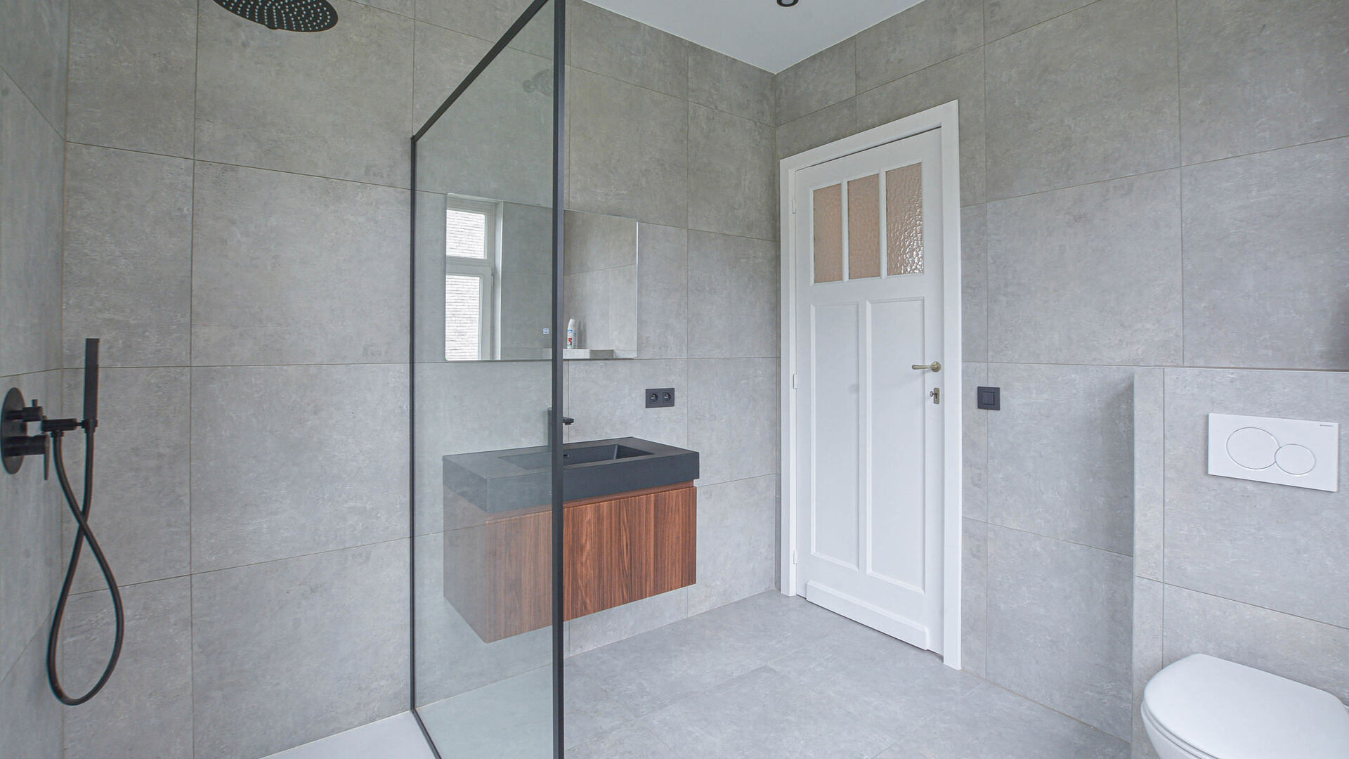 1er étage : Hall de nuit, 2 chambres à coucher +/-16-11m², salle de bains (baignoire, toilette, lavabo) et une salle de douche.