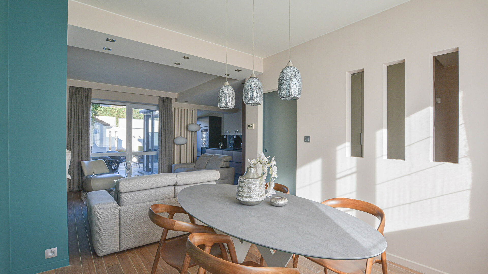 Elle allie charme, modernité et confort dans un environnement calme et pratique. Au rez-de-chaussée, un hall d’entrée avec toilettes invités dessert un vaste séjour-salle à manger lumineux avec cuisine ouverte entièrement équipée en 2023 (taque induction, hotte, 2 fours, lave-vaisselle, frigo). Cet espace convivial donne accès à une belle terrasse aménagée avec étang, espace lounge, abri de jardin, ainsi qu’un grand garage et un parking à l’avant.