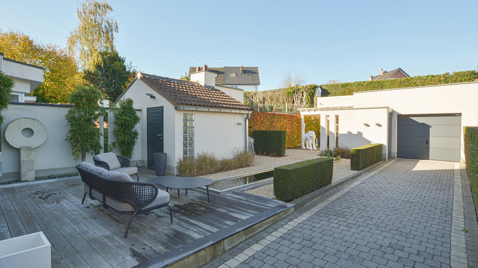 - Terrasse paysagée avec étang et coin détente