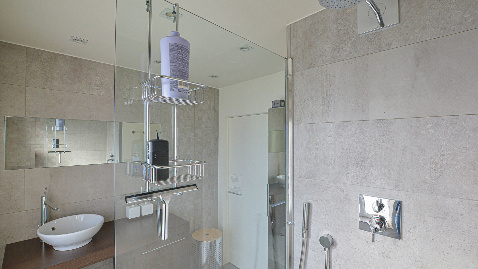 Le premier étage comprend un hall de nuit, deux chambres confortables (±17 m² et ±10 m²), dont une actuellement utilisée comme dressing, ainsi qu’une salle de bain moderne équipée d’une douche à l’italienne et d’un meuble lavabo.