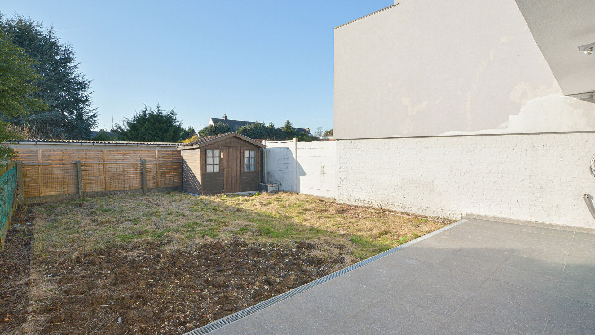 - Rez-de-chaussée : hall d’entrée avec placard intégré, spacieux séjour avec salle à manger de +/-37 m², superbe cuisine ouverte entièrement équipée avec îlot central et accès au jardin avec terrasse attenante et abri de jardin. Vous y trouverez également un WC séparé, une première chambre de +/-14 m², ainsi qu’une salle de bains avec douche et évier.